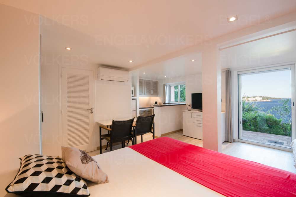 Le niveau inférieur abrite cinq studios indépendants, dont quatre bénéficient d'une vue mer. Chacun est équipé d'une salle de bains, d'une kitchenette et d'un espace extérieur privatif, garantissant à leurs occupants confort et autonomie.