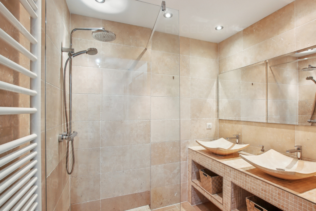 L'espace nuit comprend deux chambres avec rangements, donnant sur une terrasse intimiste, une salle d'eau raffinée avec douche à l'italienne et double vasque, ainsi qu'un WC indépendant avec lave-mains.