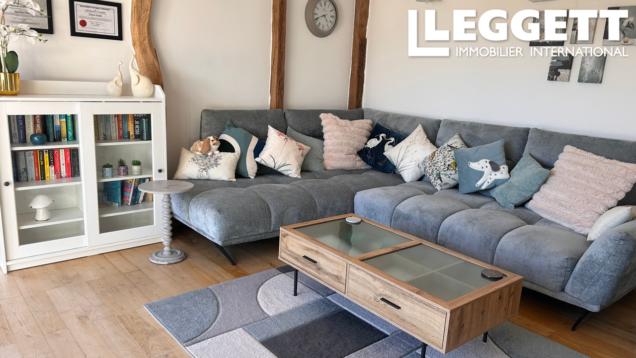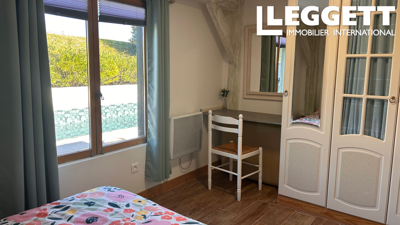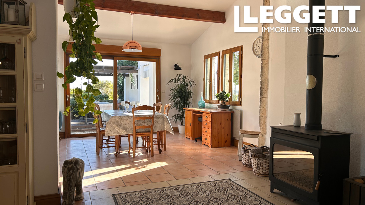 À l'intérieur, la cuisine ouverte et la salle à manger avec poêle à bois créent une ambiance conviviale, complétées par un salon lumineux avec portes-fenêtres sur la terrasse et climatisation. Suite parentale avec dressing et salle d'eau, deuxième chambre et salle de bains moderne au rez-de-chaussée, plus une suite d'amis à l'étage.