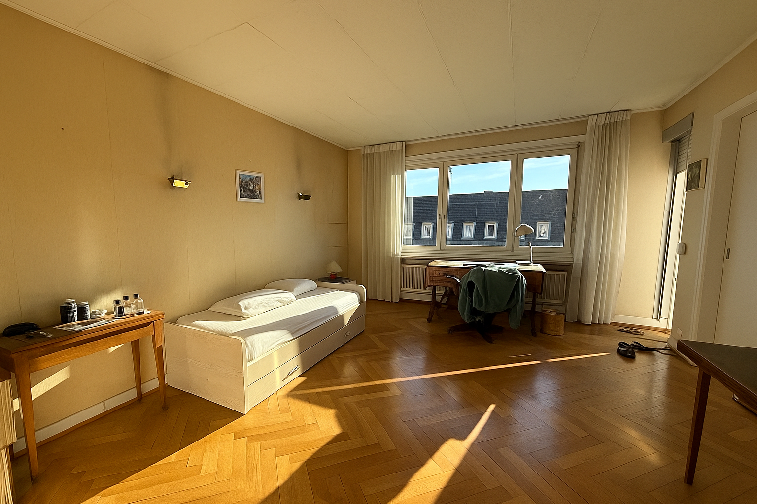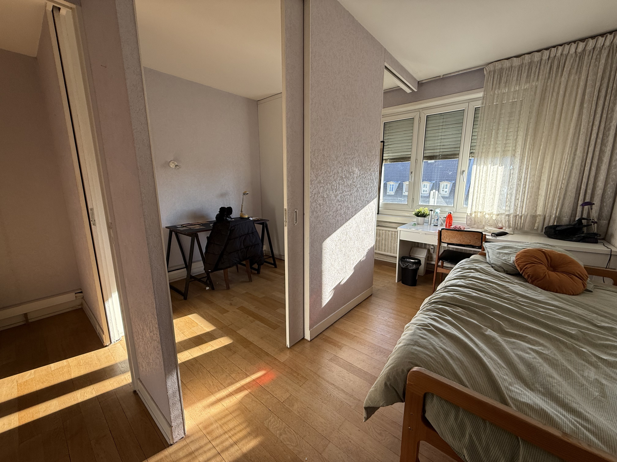 L'appartement se compose également de trois grandes chambres, dont une pouvant être aménagée en suite parentale avec salle d'eau attenante, ainsi qu'une salle de bains et des toilettes séparées.