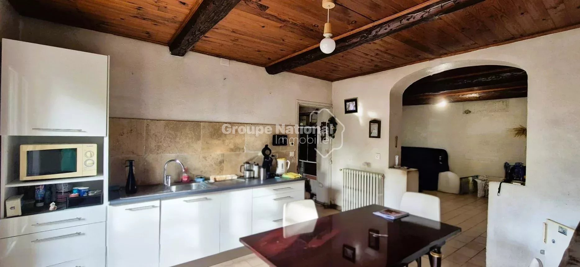 Ce mas mitoyen, d’une surface habitable d’environ 97 m², se compose au rez-de-chaussée d’un salon, d’une cuisine indépendante, d’une salle d’eau et de toilettes. À l’étage, deux grandes chambres lumineuses, un bureau, une salle de bain avec baignoire et douche ainsi qu’un toilette séparé.
