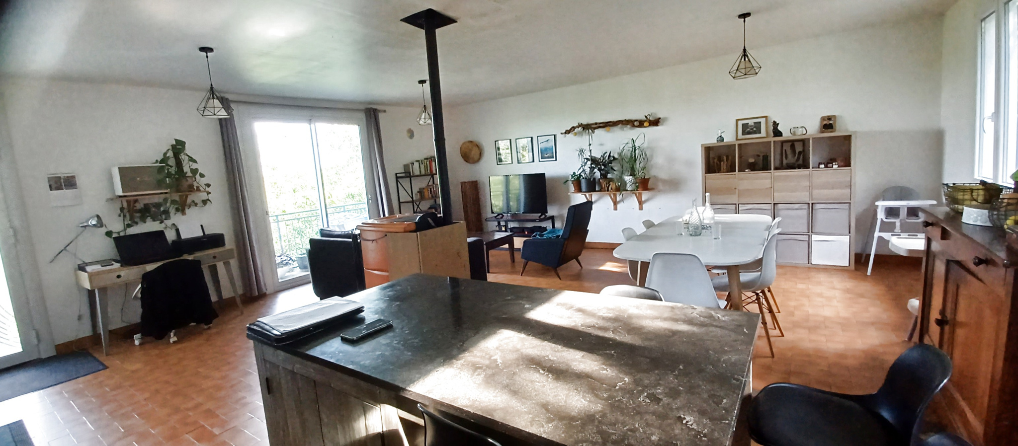 Maison élevée sur rez de jardin aménagé et particulièrement bien agencée, rénovée en 2017 ; comprenant 2 chambres dont 1 avec baie ouvrant sur terrasse et jardin, buanderie (arrivée d'eau permettant salle d'eau), atelier communicant avec un garage pour 2 véhicules. Au-dessus (accès intérieur et extérieur) : grand salon séjour, baie ouvrant sur balcon-terrasse avec vue dégagée, espace cuisine simple, 3 chambres, salle de bains avec fenêtre et wc séparé. Très bonne isolation des murs et sous couverture, double vitrage 2017. Chauffage principal : poêle à granulés et radiateurs électriques avec thermostat (DPE D). Stationnement privé devant la propriété.