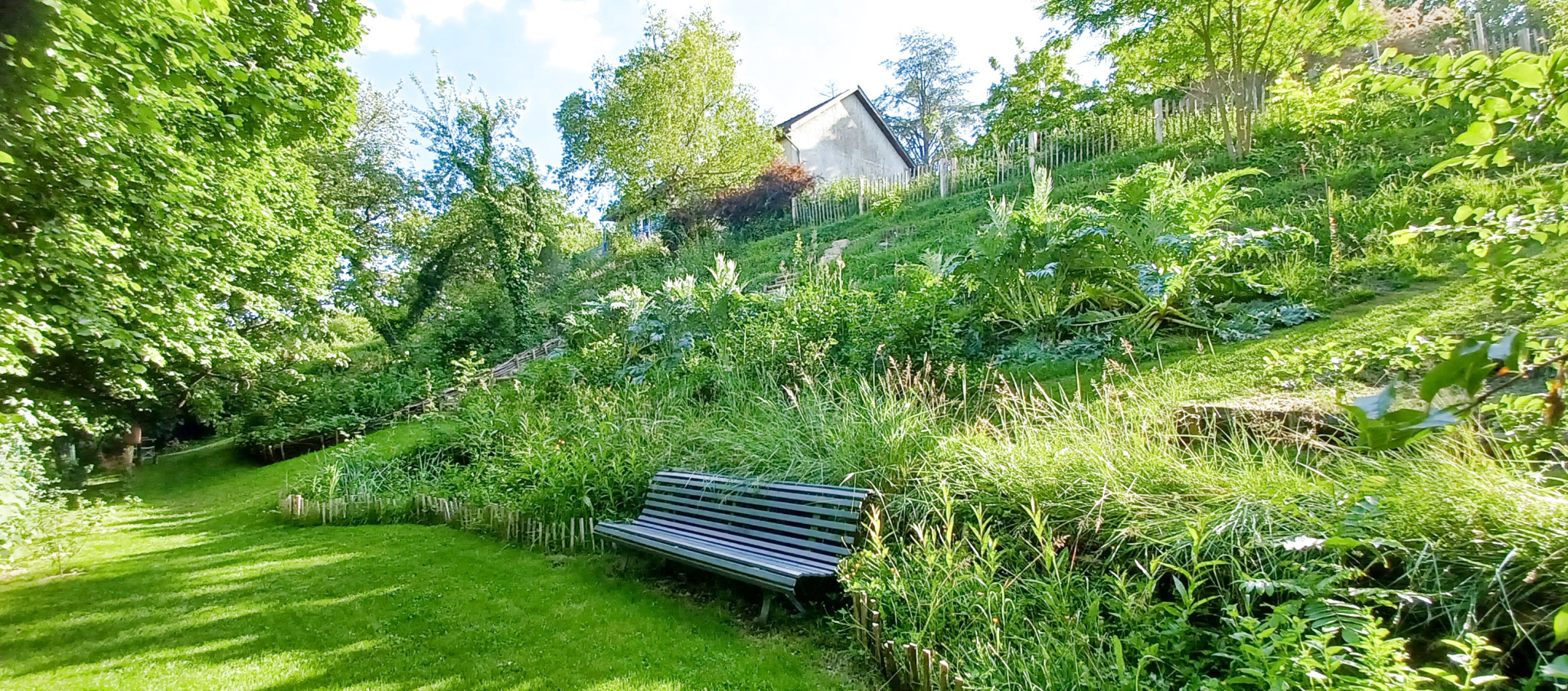 Très agréable jardin paysagé sur env.1400 m2 avec divers espaces, arborés, ombragés et fleuris, potager, entièrement clos et sans vis à vis. Secteur résidentiel calme et prisé sur les hauteurs, à 5 minutes de Moulins.