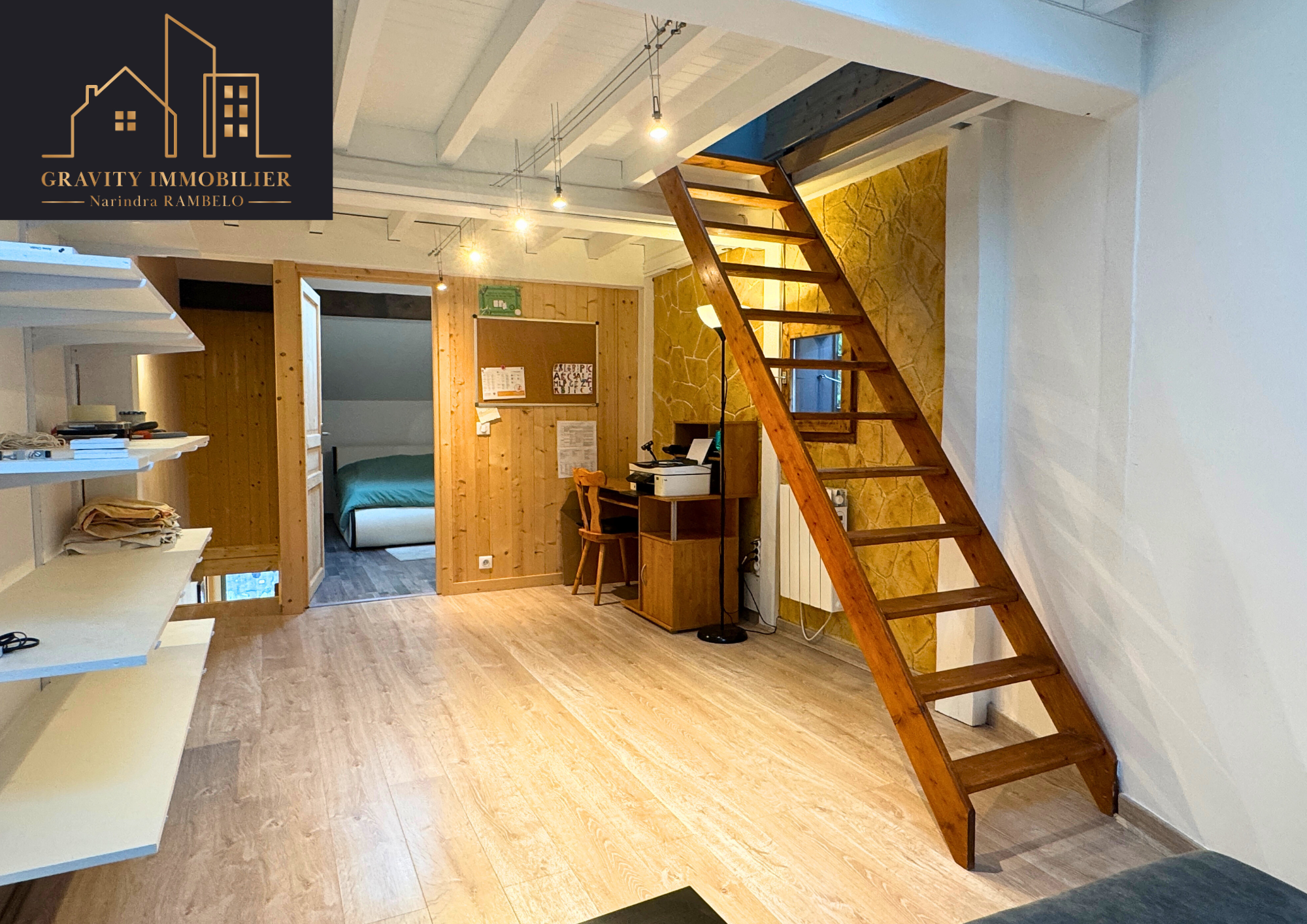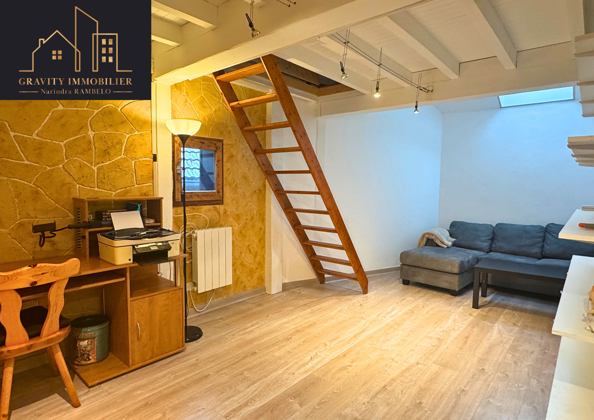 Niveau principal (2ème étage) : une entrée avec placard, une pièce de vie lumineuse avec cuisine entièrement équipée, ouverte sur le séjour, ainsi qu'une salle d'eau moderne.