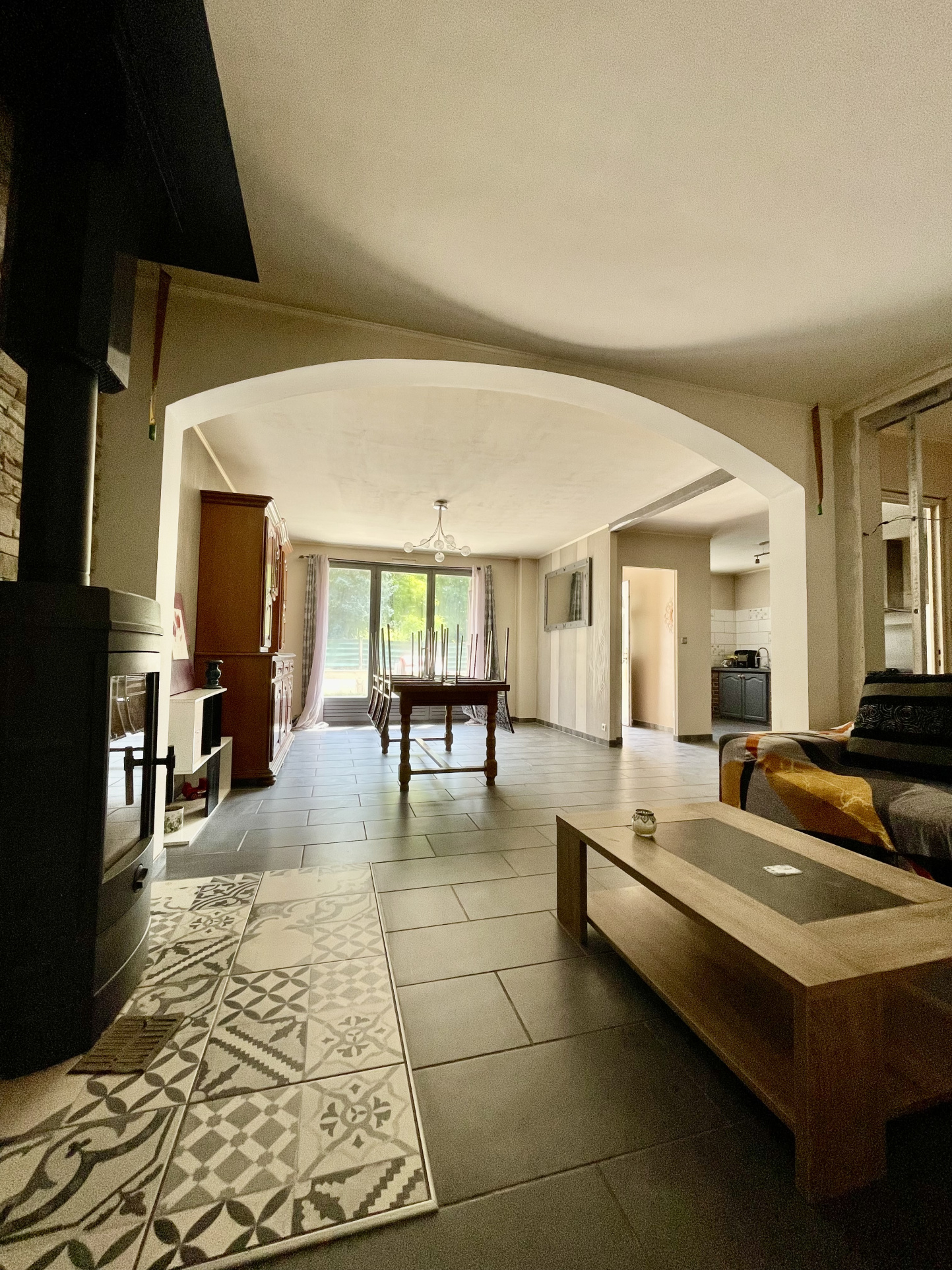 Spacieux séjour avec poêle à bois ouvert sur la cuisine, l'ensemble représentant environ 47 m2