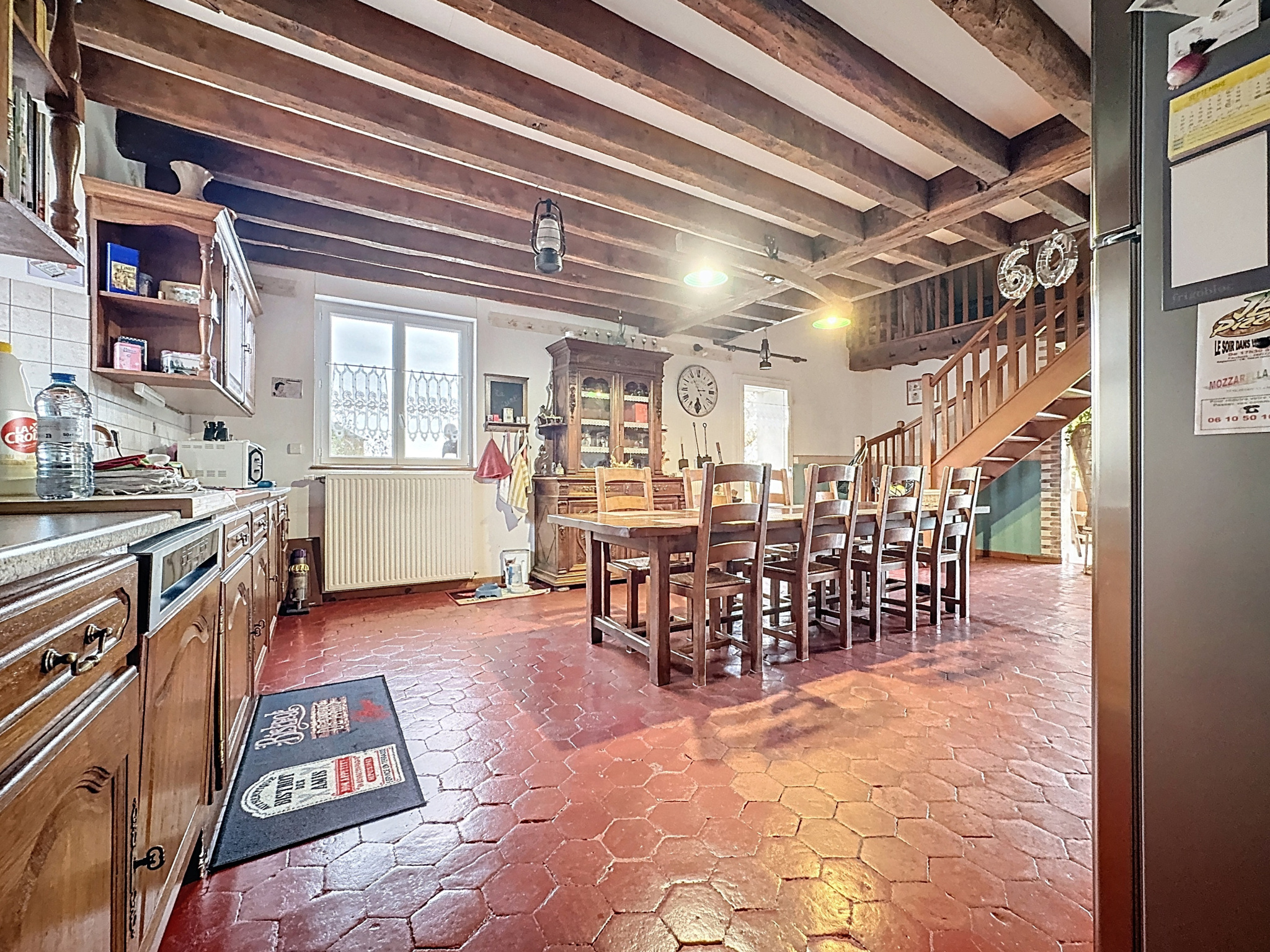 Corps de ferme comprenant : entrée sur bureau avec accès chaufferie et chambre froide, pièce de passage, salon, cuisine dinatoire aménagée équipée, seconde pièce de passage avec coin buanderie, salle de bains-douche, toilettes, à l'étage : coursive desservant trois chambres, un second escalier desservant deux chambres, salle d 'eau toilettes. En annexe : garage double avec grenier, cave voutée, grange compartimenté en trois travées et auvent, hangar d'ensilage de 240 m2 sur dalle béton, cour sur l'avant, jardin et pâture sur l'arrière, le tout sur une parcelle de 8996 m2 environ.