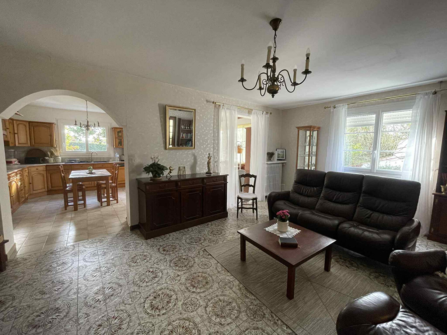 Elle offre une belle entrée baignée de lumière, un agréable salon-séjour avec insert, une cuisine aménagée et équipée, ainsi qu'une véranda pour profiter de chaque saison.