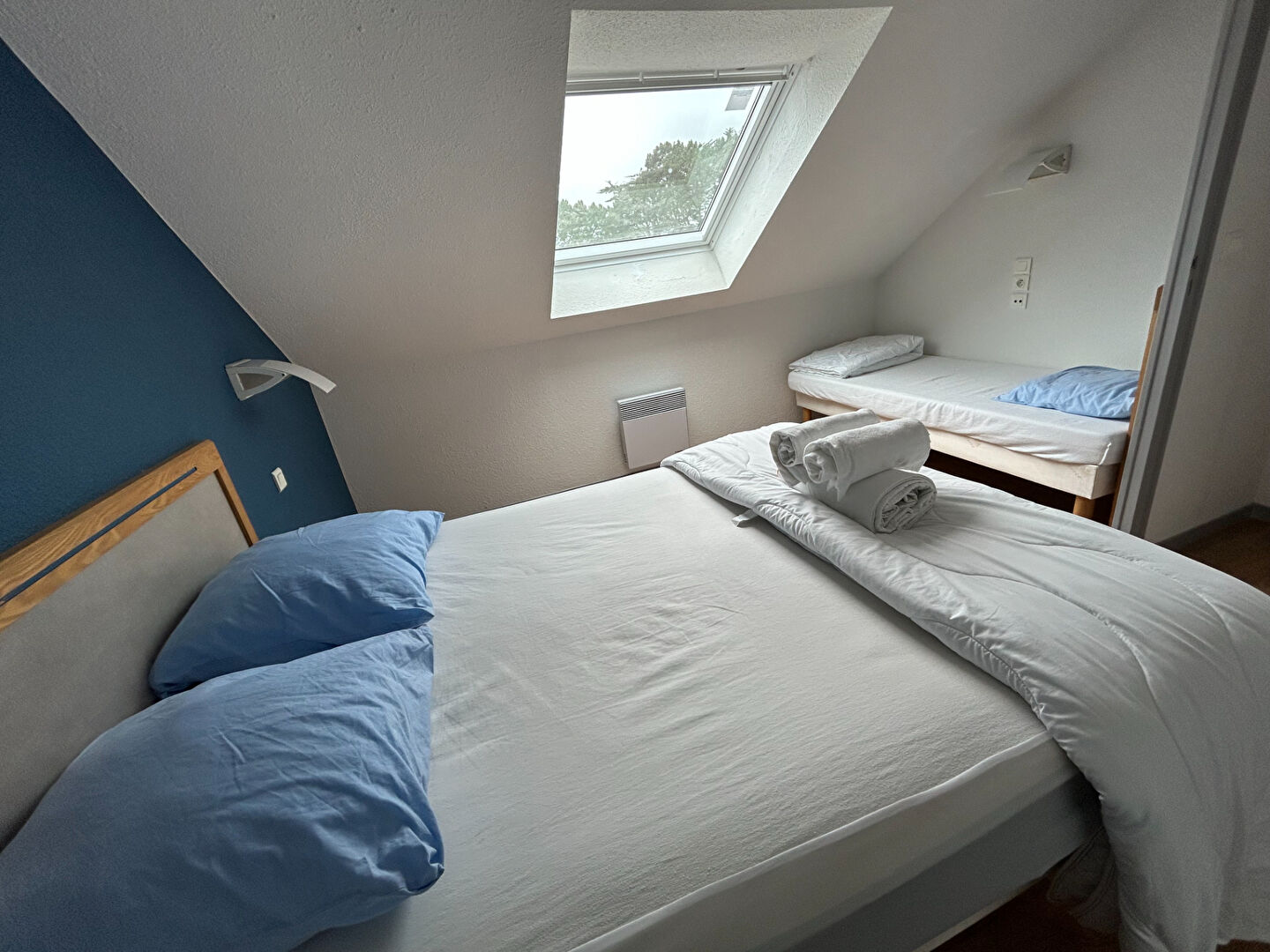 L'étage se compose d'un palier donnant accès à une chambre avec placards.