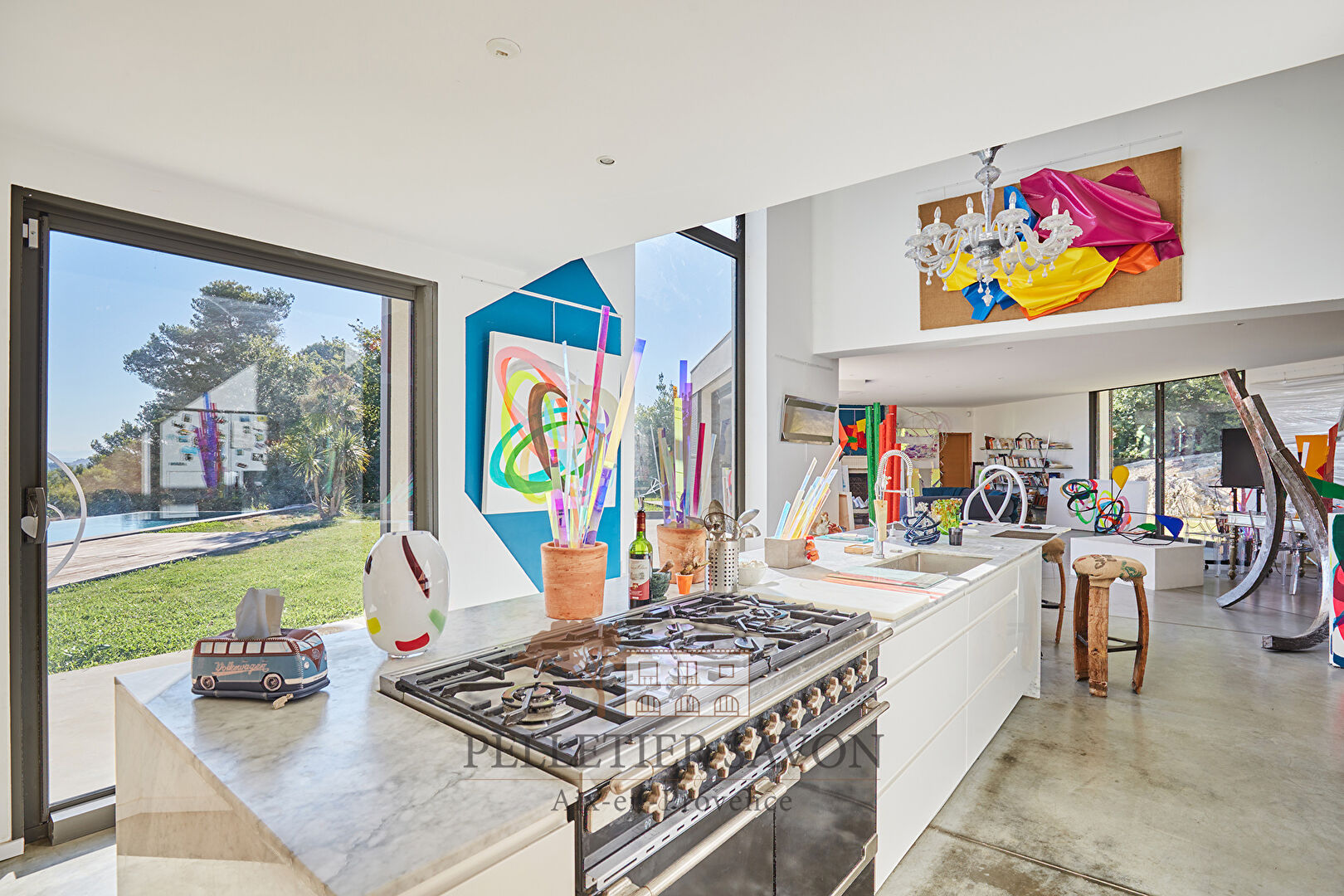 L'espace de vie principal développe plus de 110 m² et comprend une vaste réception, une salle à manger et une cuisine ouverte entièrement équipée. Cette dernière est organisée autour d'un îlot central de 5 x 1,20 mètres et offre à elle seule plus de 30 m². L'ensemble s'ouvre grâce à de larges baies vitrées à galandage sur une terrasse de 100 m², offrant une continuité parfaite entre intérieur et extérieur, avec la piscine et la vue panoramique en toile de fond.