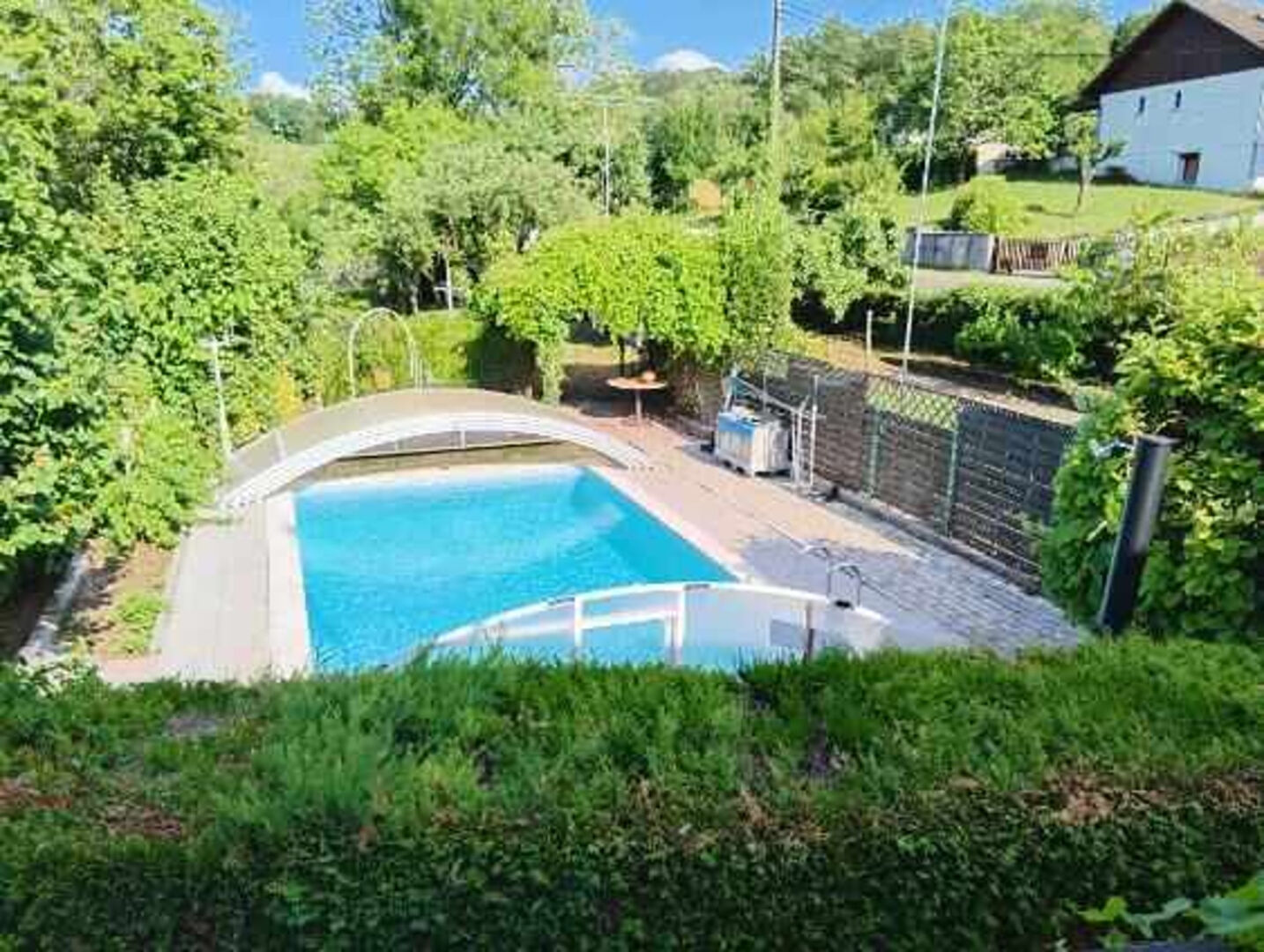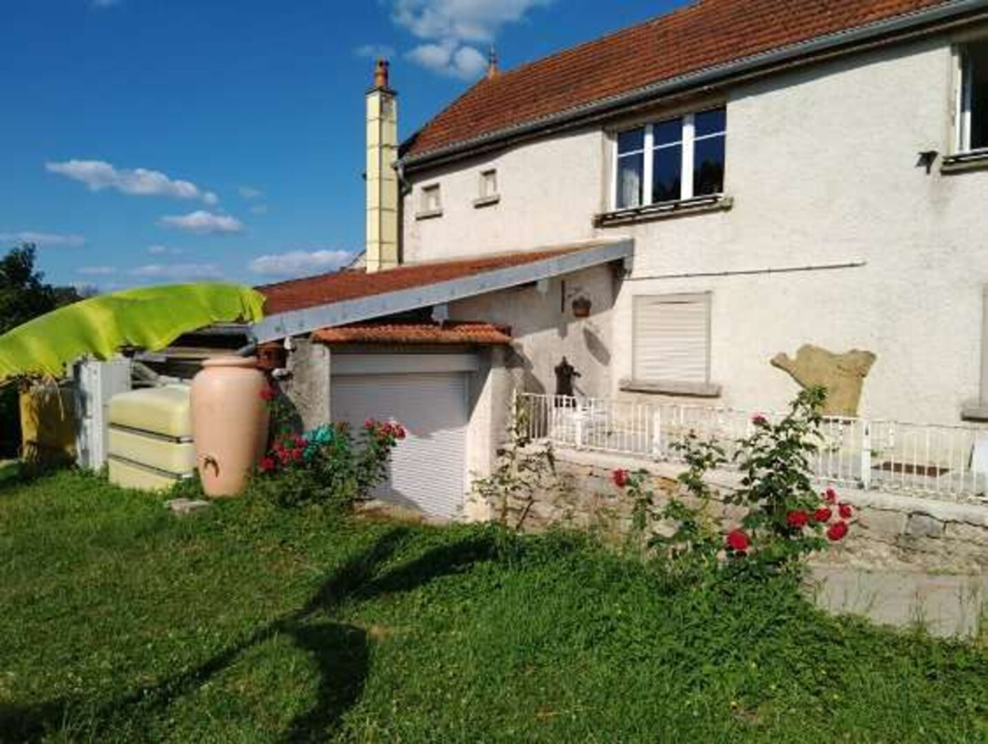 Proximité d'une route passante mais environnement verdoyant et sans vis-à-vis.