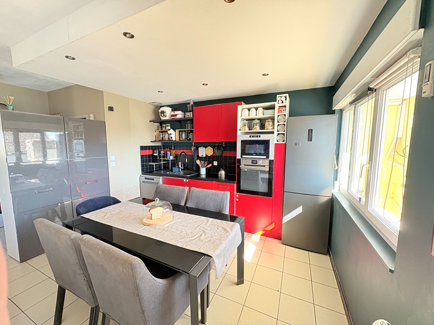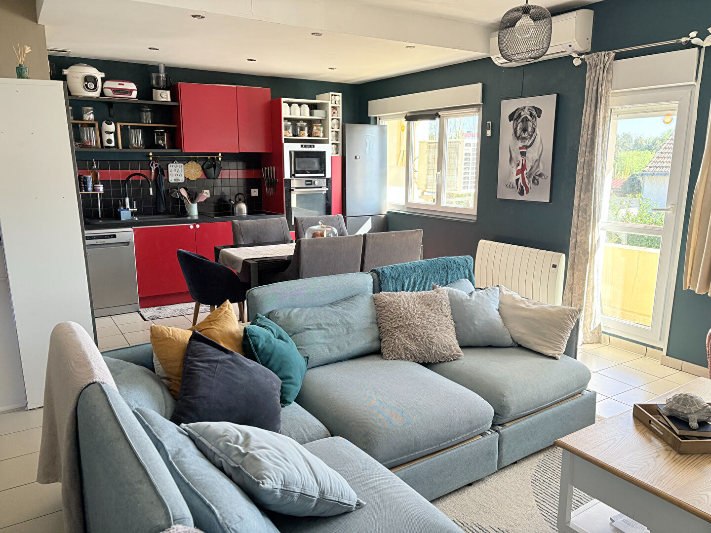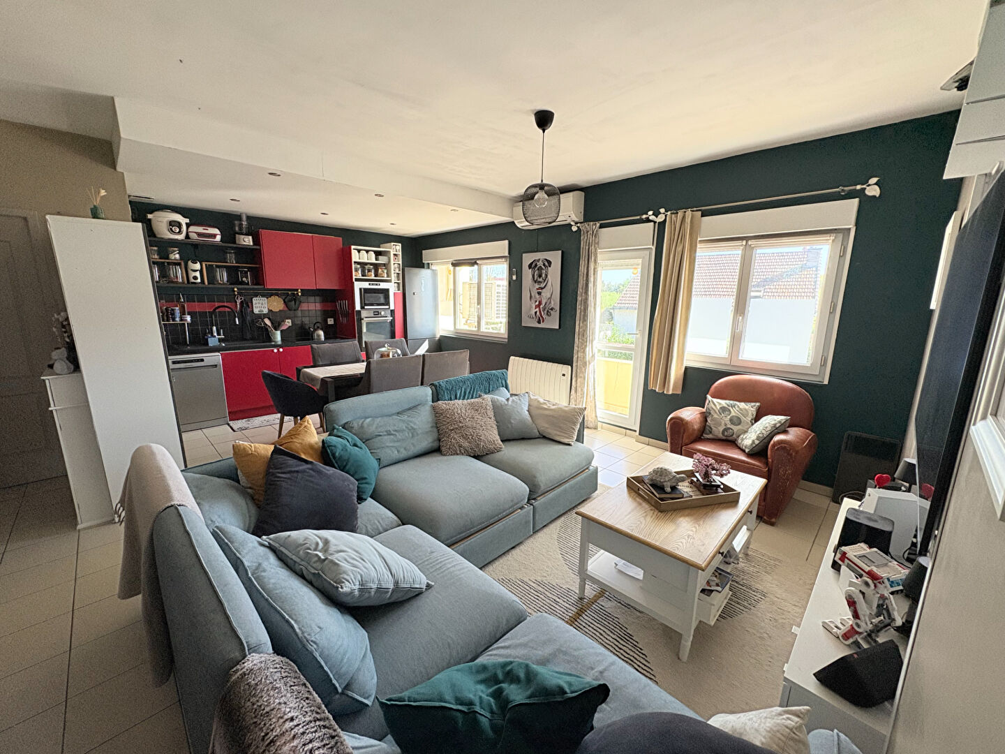 Pièce de vie spacieuse avec cuisine aménagée ouverte, 3 chambres, une salle d'eau et un balcon plein sud.