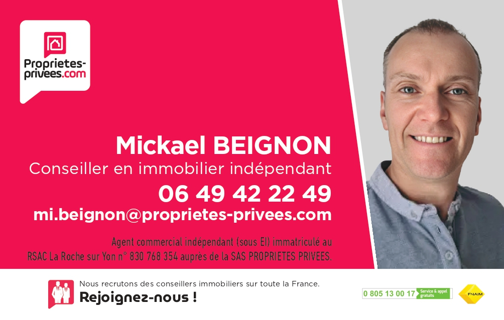 Cette présente annonce a été rédigée sous la responsabilité éditoriale de Mickael BEIGNON agissant sous le statut d'agent commercial immatriculé au RSAC 830768354 LA ROCHE SUR YON auprès de SAS PROPRIETES PRIVEES, au capital de 44 920 euros, ZAC LE CHÊNE FERRÉ - 44 ALLÉE DES CINQ CONTINENTS 44120 VERTOU; SIRET 487 624 777 00040, RCS Nantes. Carte Professionnelle Transactions sur immeubles et fonds de commerce (T) et Gestion immobilière (G) n°CPI 4401 2016 000 010 388 délivrée par la CCI Nantes - Saint Nazaire. Compte séquestre n°30932508467 BPA SAINT-SEBASTIEN-SUR-LOIRE (44230). Garantie GALIAN-SMABTP - 89 rue de la Boétie, 75008 Paris - n°28137 J pour 2 000 000 euros pour T et 120 000 euros pour G. Assurance responsabilité civile professionnelle par GALIAN-SMABTP n° de police 28137.J