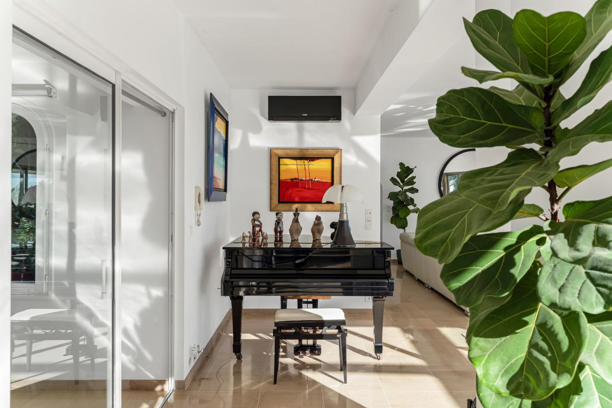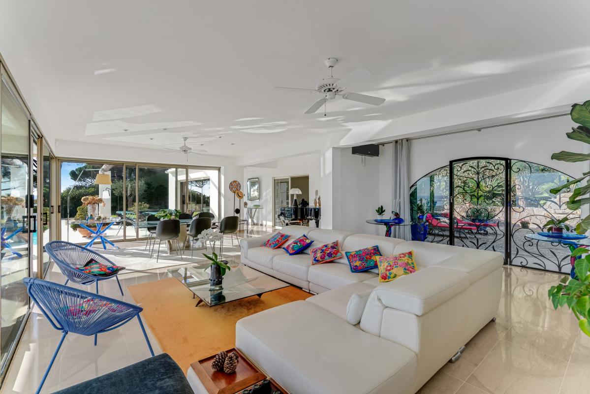 Le vaste séjour s'ouvre sur de larges baies vitrées qui prolongent naturellement les espaces de réception vers l'extérieur, offrant une continuité parfaite entre la vie intérieure et la mer.