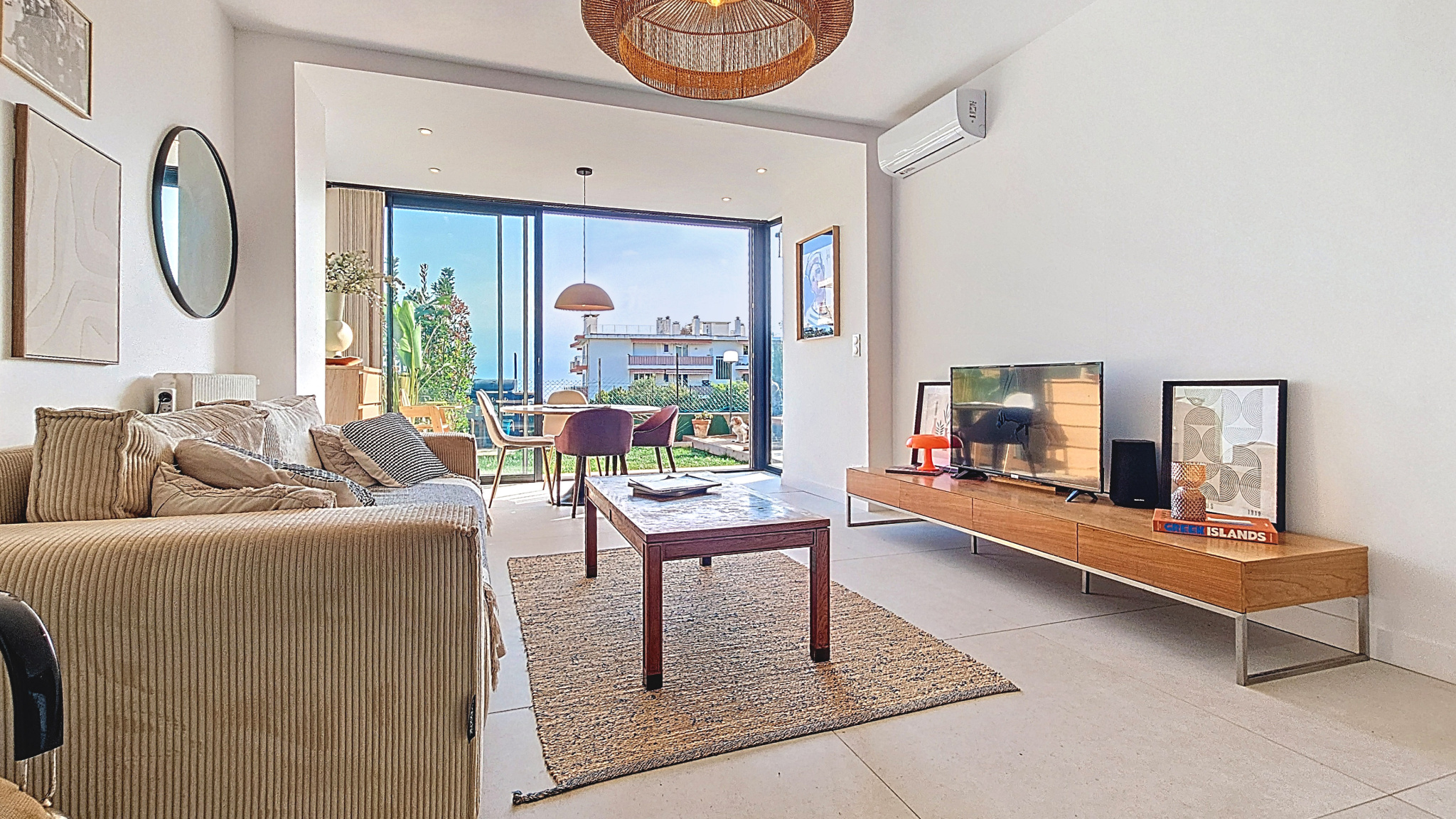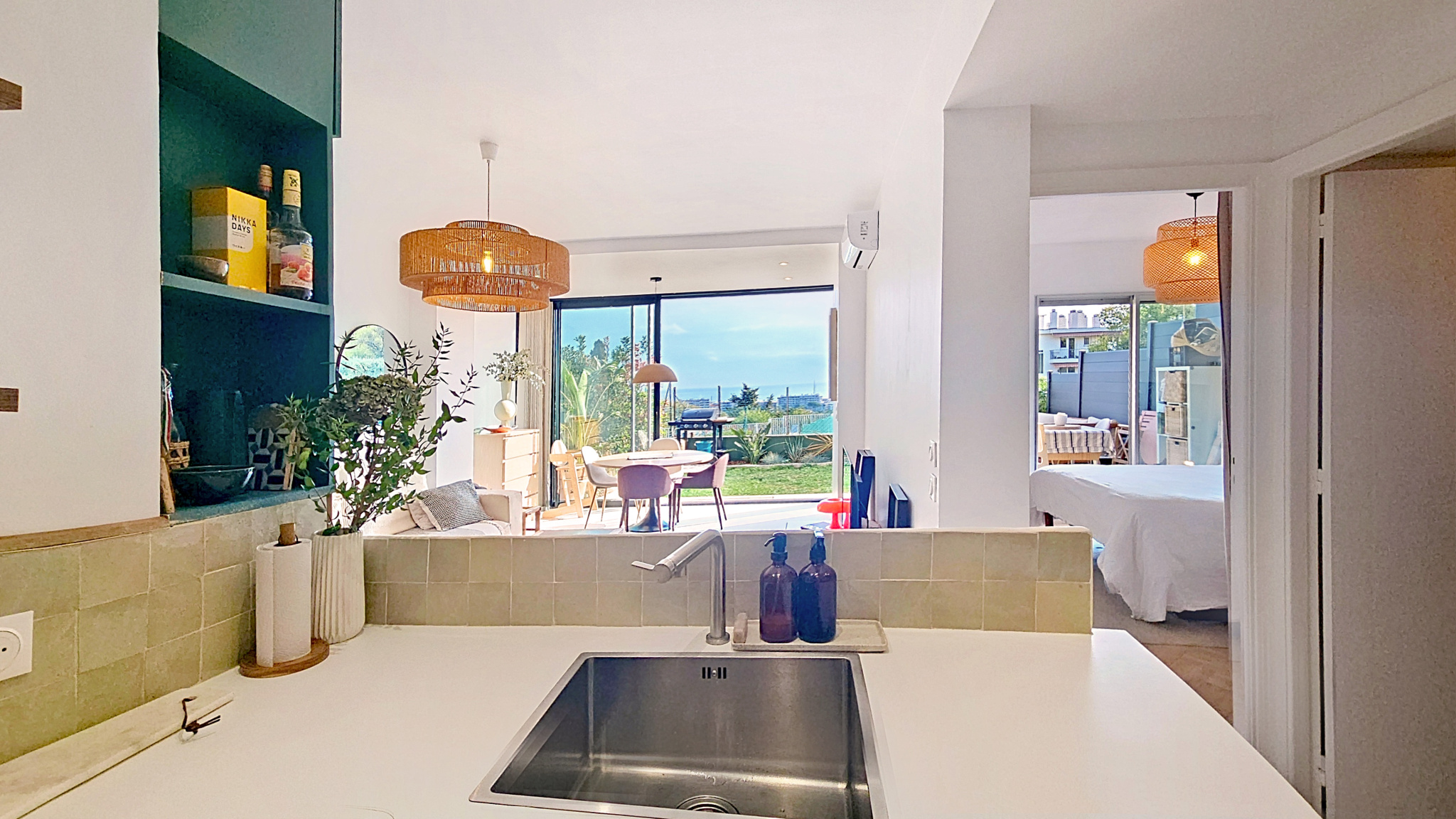 Vue mer depuis toutes les pièces, belle terrasse et petit jardin privé prolongent agréablement l'espace de vie.