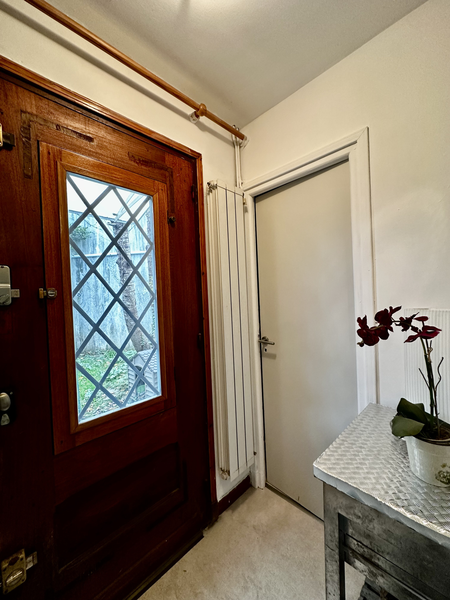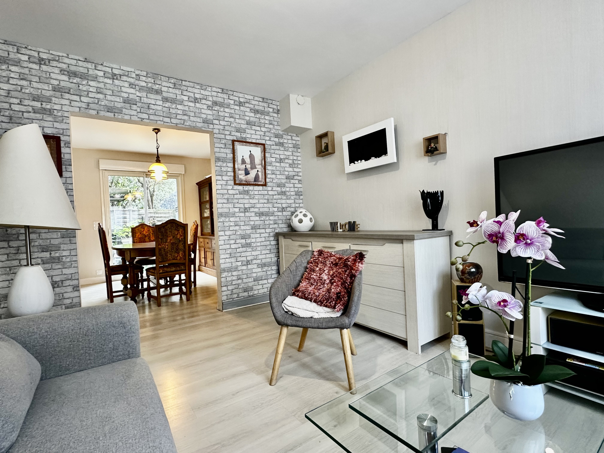La maison dispose également d'un garage, d'une cave et d'un jardin intimiste avec terrasse, laissant envisager un projet d'agrandissement ou l'installation d'une véranda.