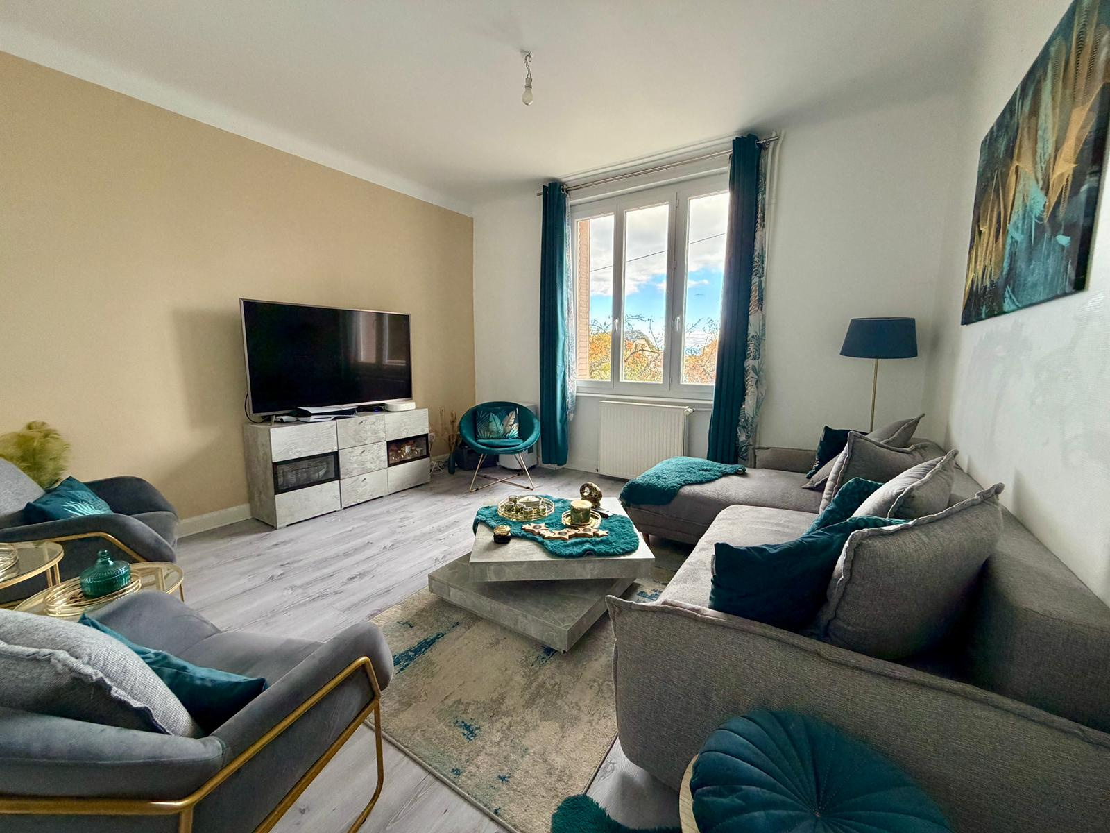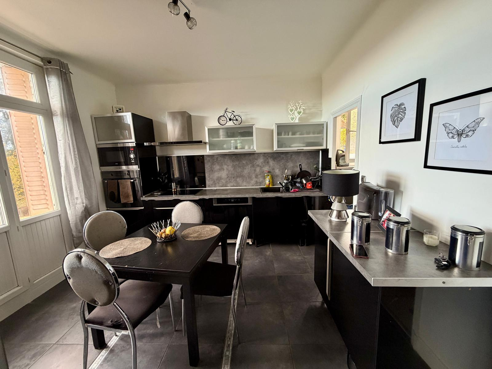 - Au 1e étage : un T3 de 70 m2 entièrement rénové, actuellement loué, comprend une cuisine séparée et équipée, un séjour lumineux, une salle d'eau avec douche et WC séparé.