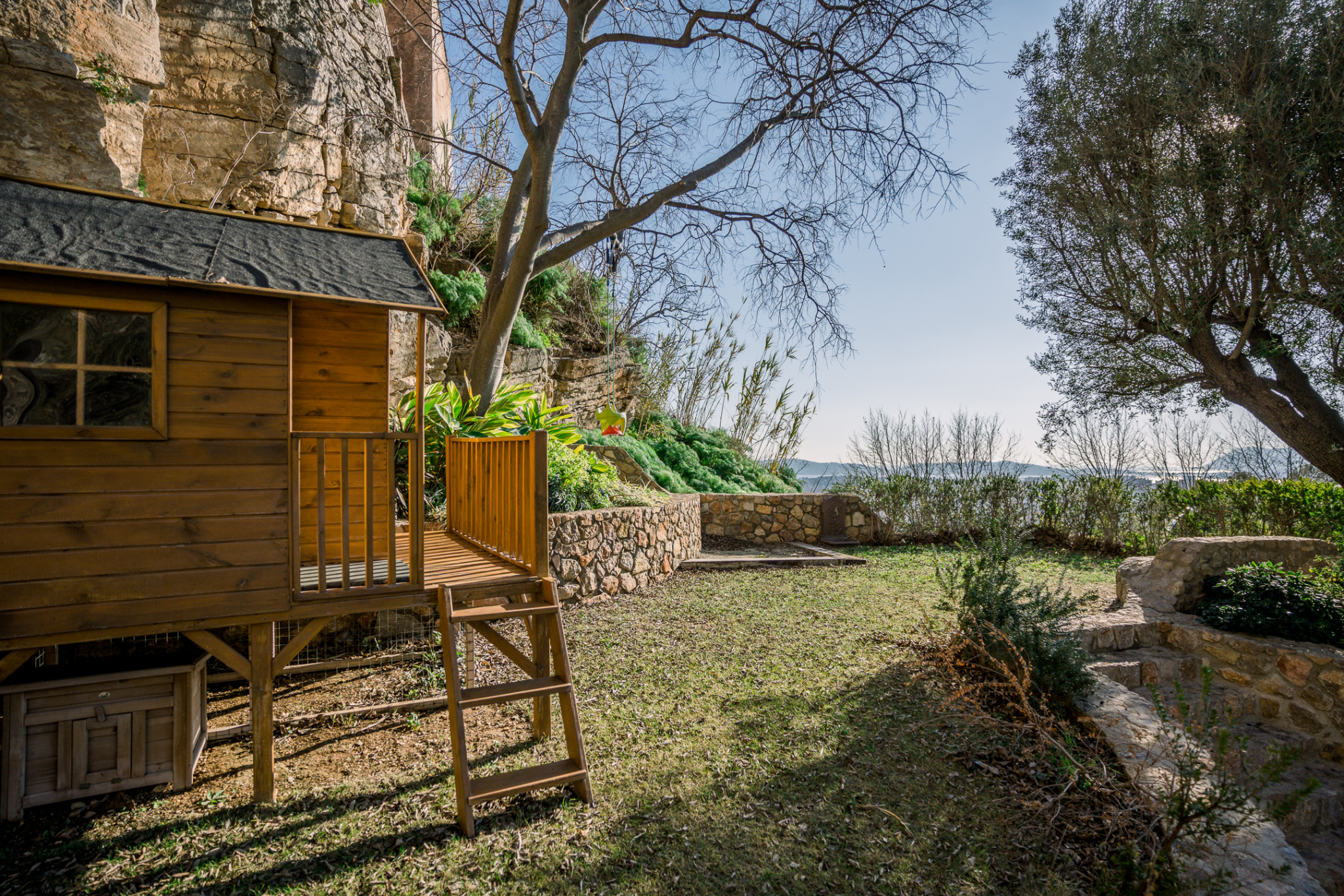 Les extérieurs ont été soigneusement aménagés : jardin suspendu, arbres fruitiers, murs en pierre, éclairage paysager, portail et porte de garage automatiques, espace de stationnement pour deux véhicules.