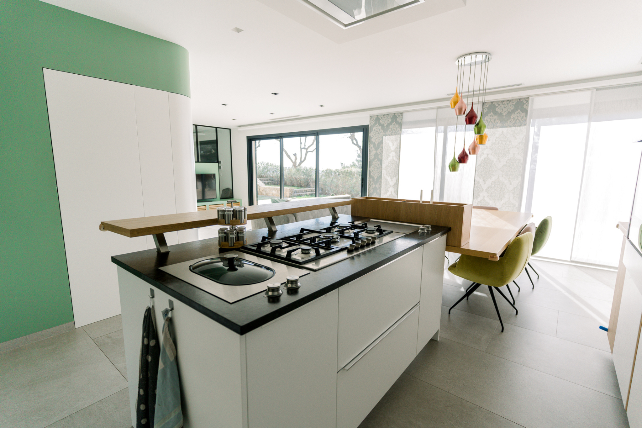 La cuisine, conçue sur mesure autour d'un îlot central, s'intègre parfaitement à cet espace ouvert. Dans le prolongement, une vaste terrasse d'environ 70 m2 avec piscine chauffée devient le coeur de la maison, idéale pour recevoir ou se détendre en toute intimité.