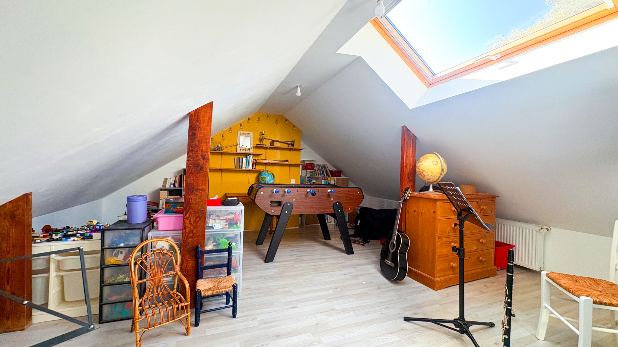 À l'étage, l'espace se poursuit avec deux chambres mansardées, dont une équipée d'un dressing en enfilade, ainsi qu'une salle d'eau avec toilette intégré. Une mezzanine vient compléter cet ensemble, offrant un lieu de détente ou un espace de jeux idéal.
