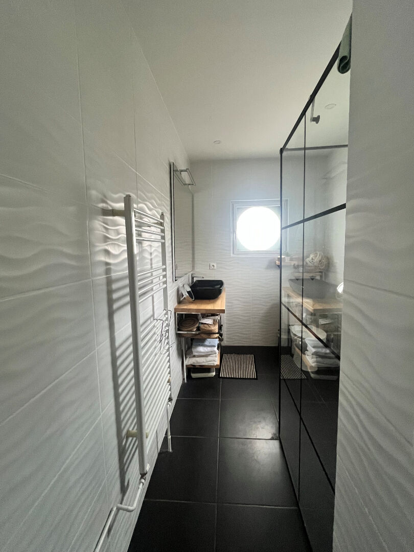 Elle offre un vaste salon séjour plein sud avec poêle à bois, une cuisine équipée avec arrière-cuisine, une vaste chambre, une salle d'eau avec wc et un bureau au rez-de-chaussée. À l'étage, trois chambres dont une avec terrasse couverte, une salle d'eau, un WC séparé et deux greniers aménageables complètent l'ensemble.