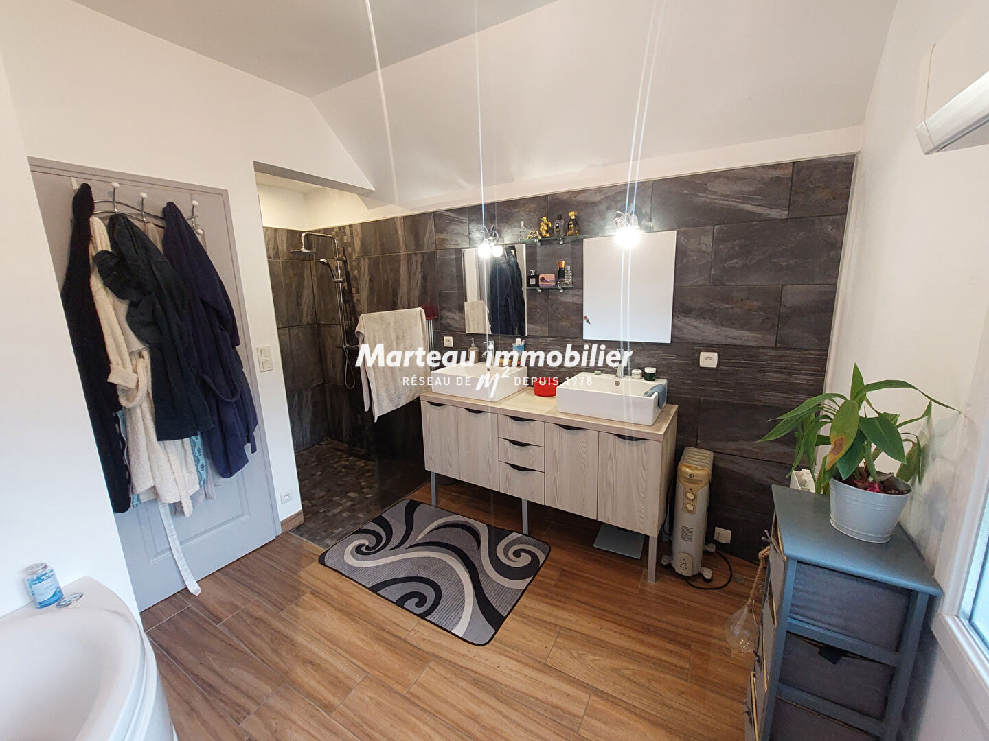 Au RDC : cuisine ouverte aménagée et équipée, grande pièce de vie avec salon cheminée insert, séjour lumineux, et belle salle d'eau avec douche à l'italienne et jacuzzi.