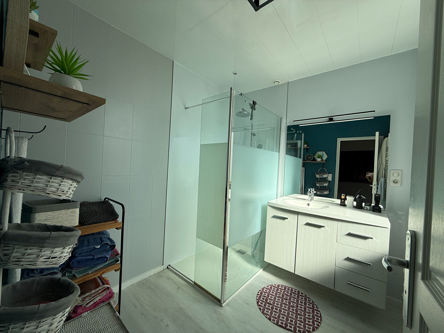Elle se compose au rdc d'une grande entrée avec placards, un vaste séjour lumineux avec un espace salon agrémenté d'un poêle à bois, une cuisine aménagée et équipée, ouverte sur une terrasse esprit patio, propice aux moments conviviaux.
