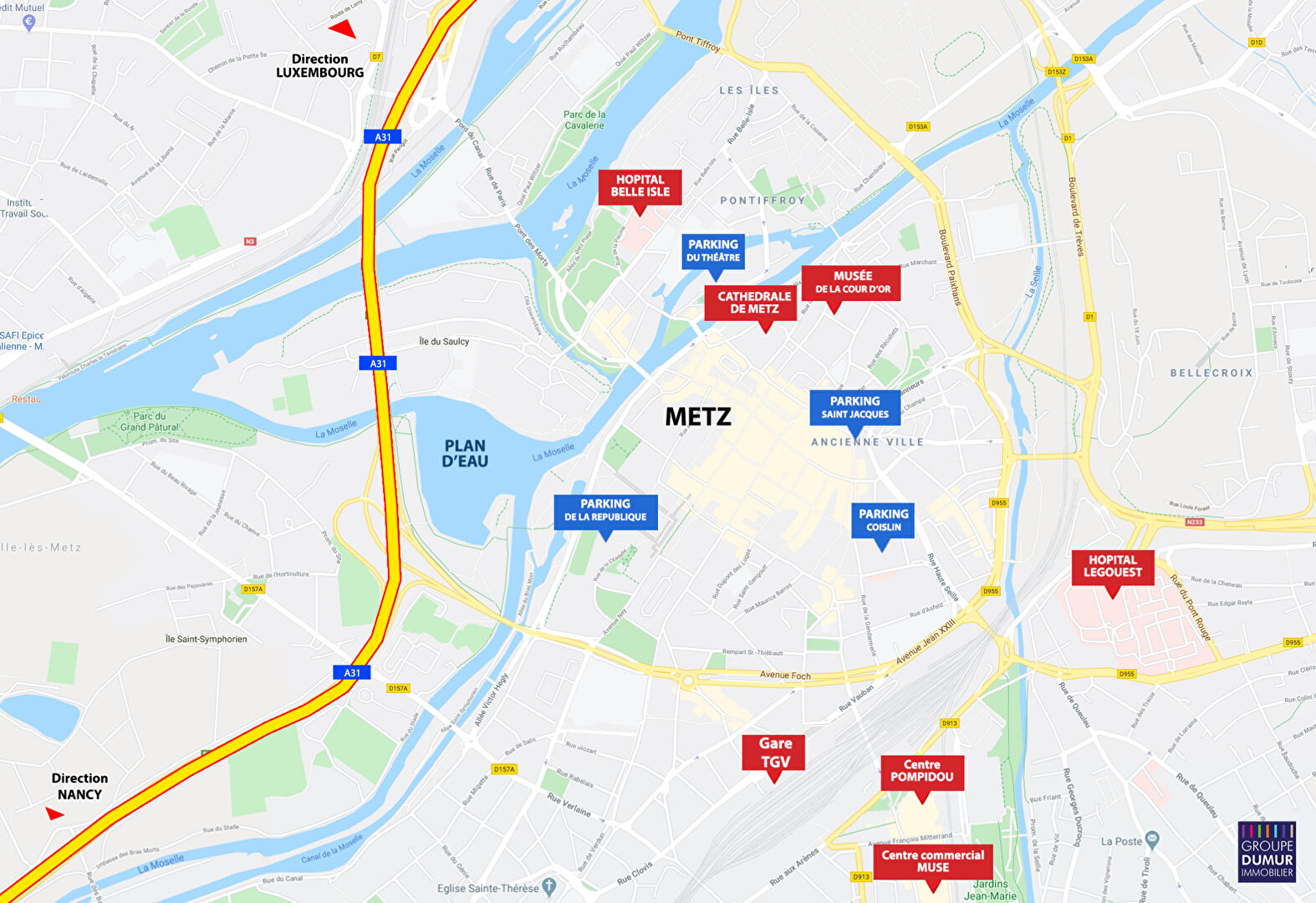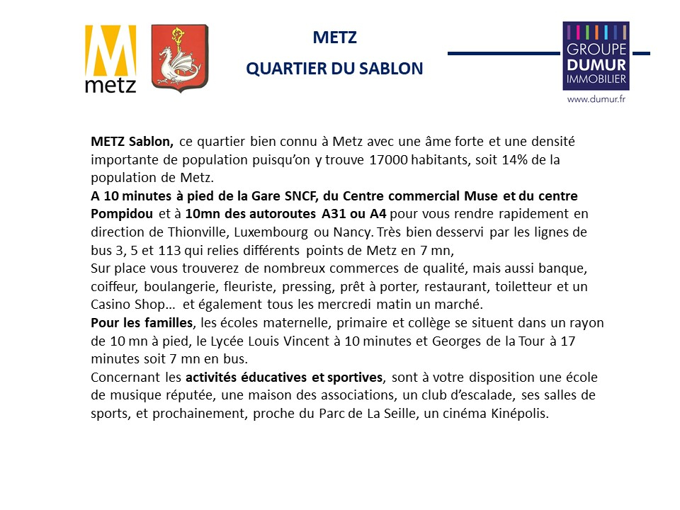 Metz Sablon : Situé dans quartier dynamique, à 1 minutes à pied de la gare, à proximité des commerces, bien desservi pat les transports en commun, à10 minutes à pied du centre ville et du centre commercial Muse.