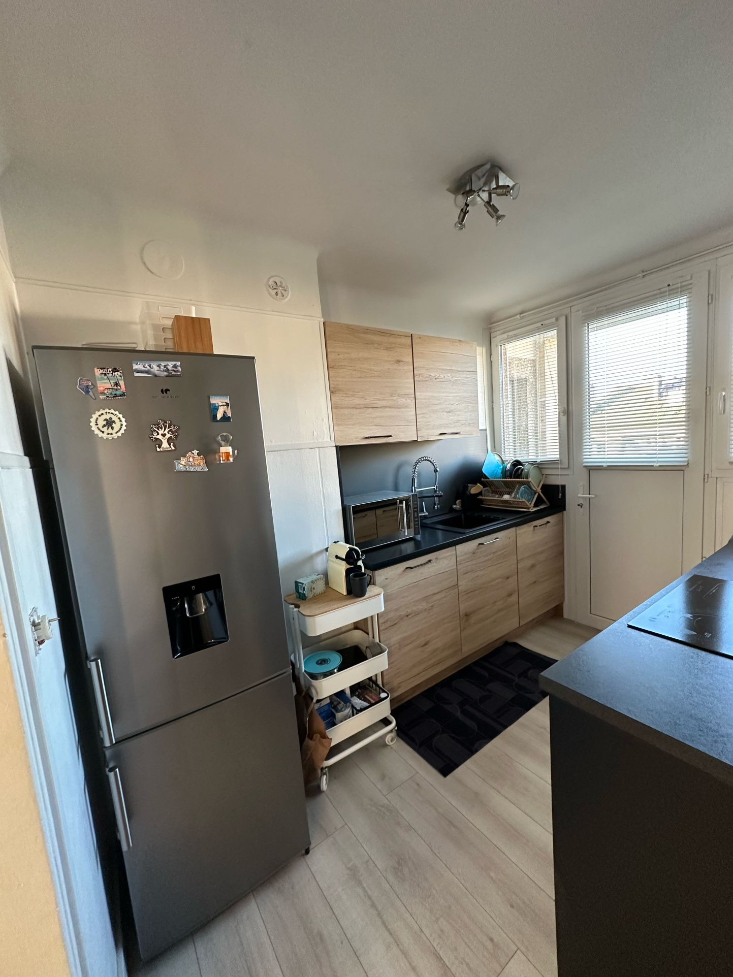 Il est composé d'une entrée avec placards, une cuisine équipée et aménagée avec accès au balcon, une spacieuse piece de vie avec parquet chêne, deux chambres, une salle d'eau, et des WC séparés.