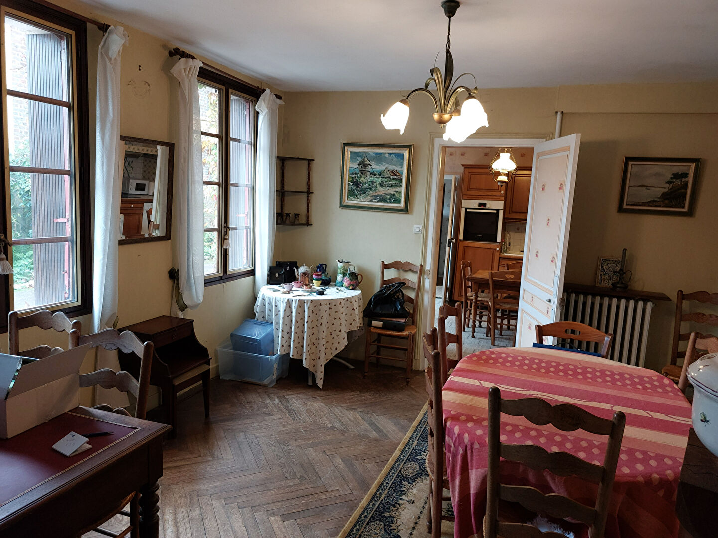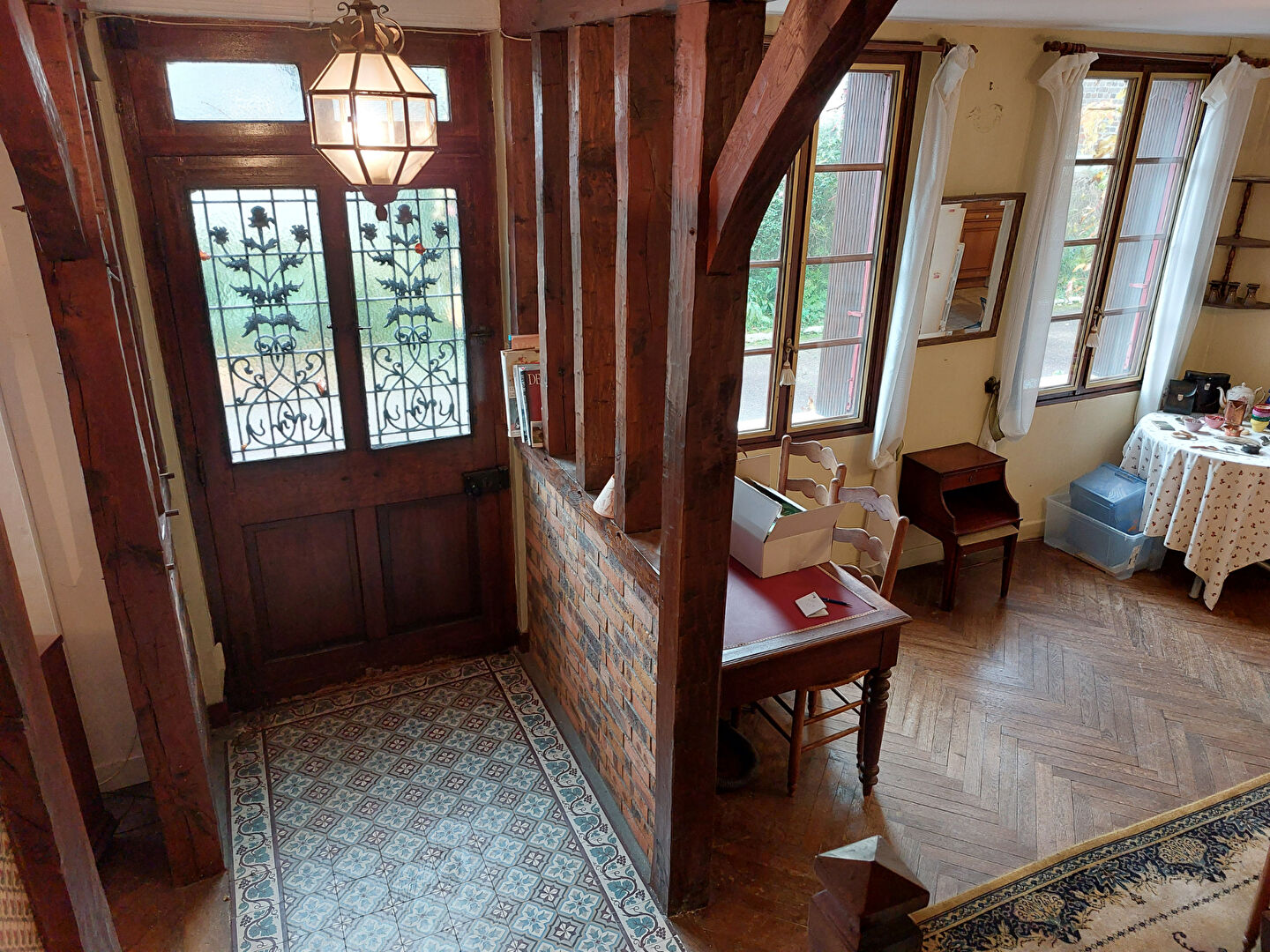 Au rez -de-chaussée, on trouve une entrée ornée de carreaux de ciment, un salon spacieux doté d'une cheminée, une salle à manger baignée de lumière et une cuisine aménagée et équipée.