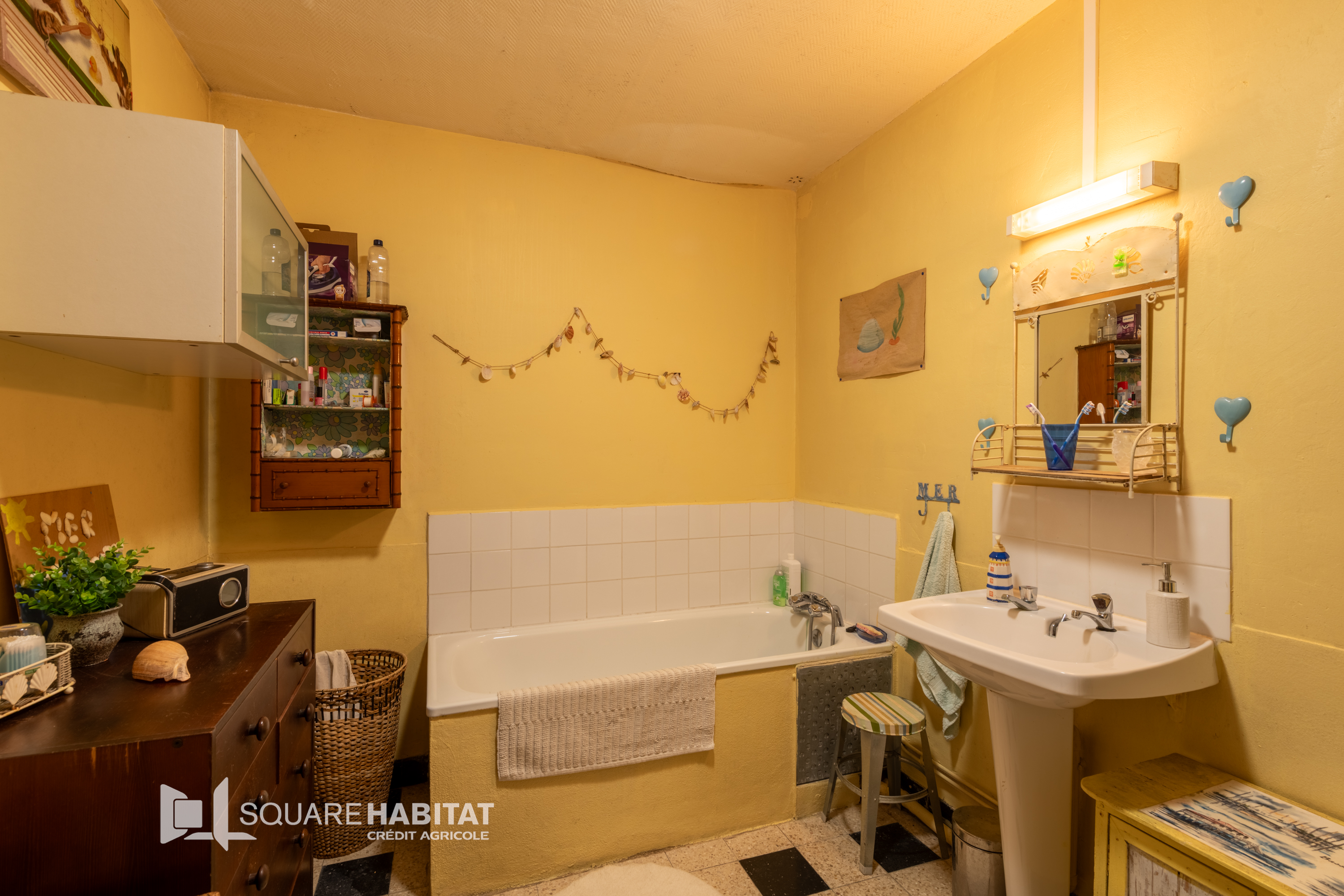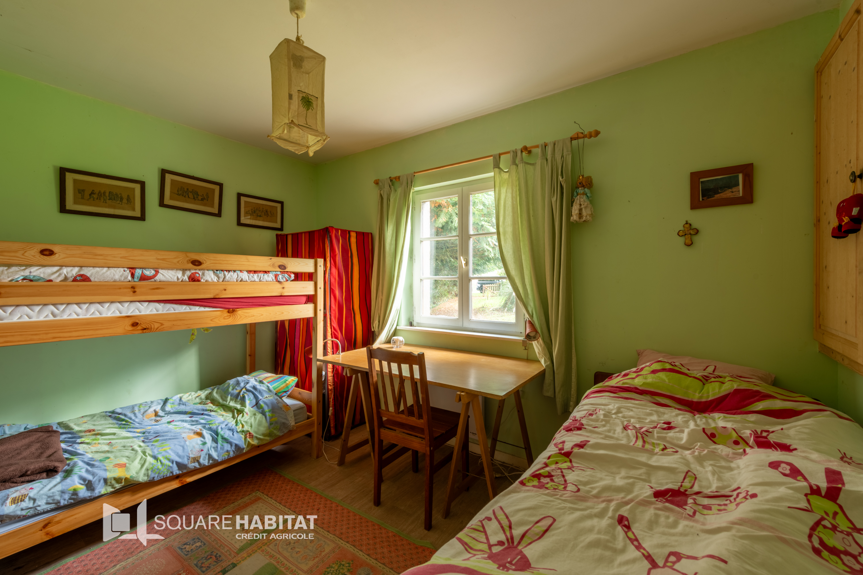 Entrée sur cuisine avec grand placard, spacieux séjour salon avec cheminée insert, 2 chambres, salle de bains, salle de douche, 2 wc, coin laverie