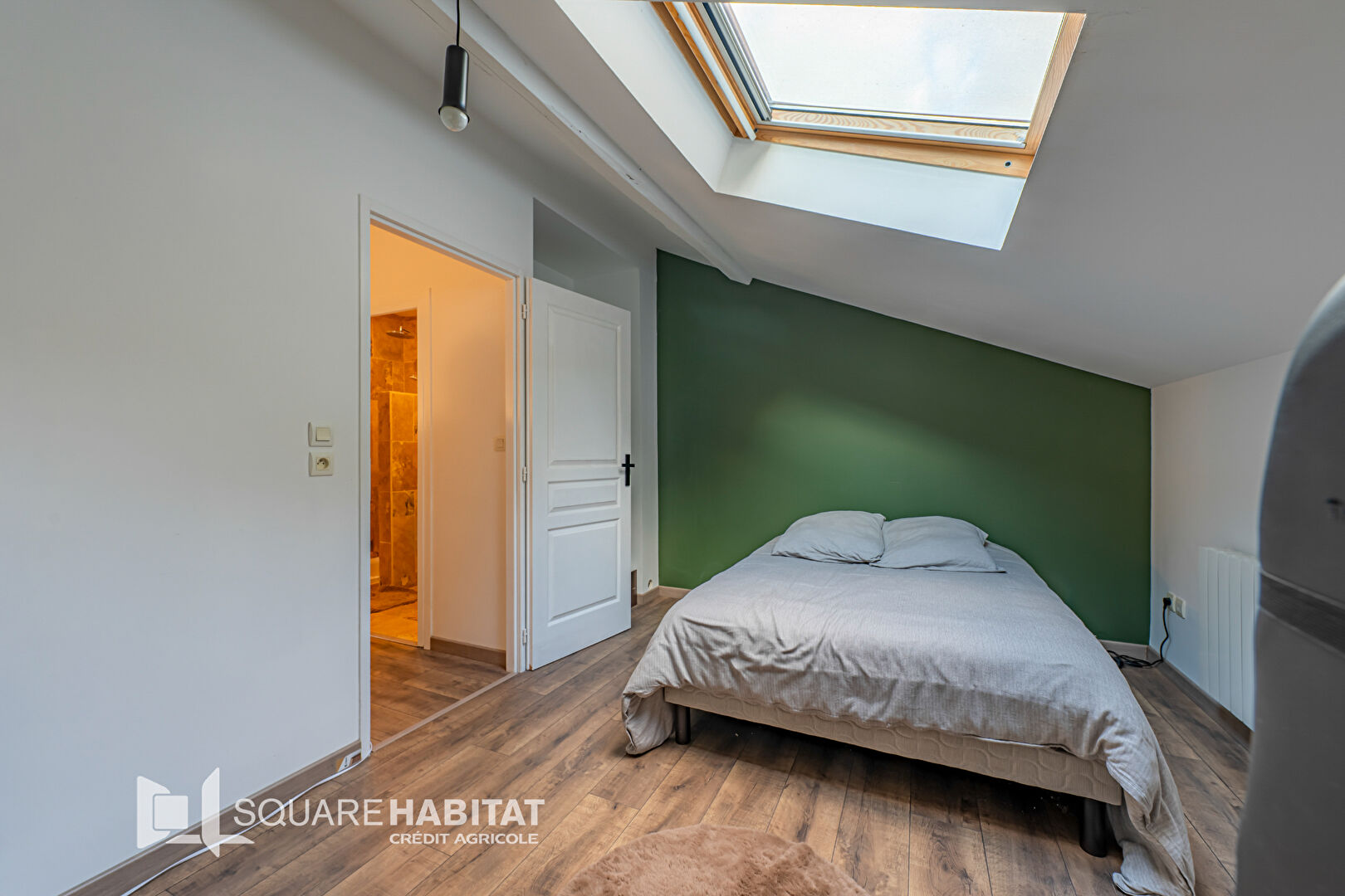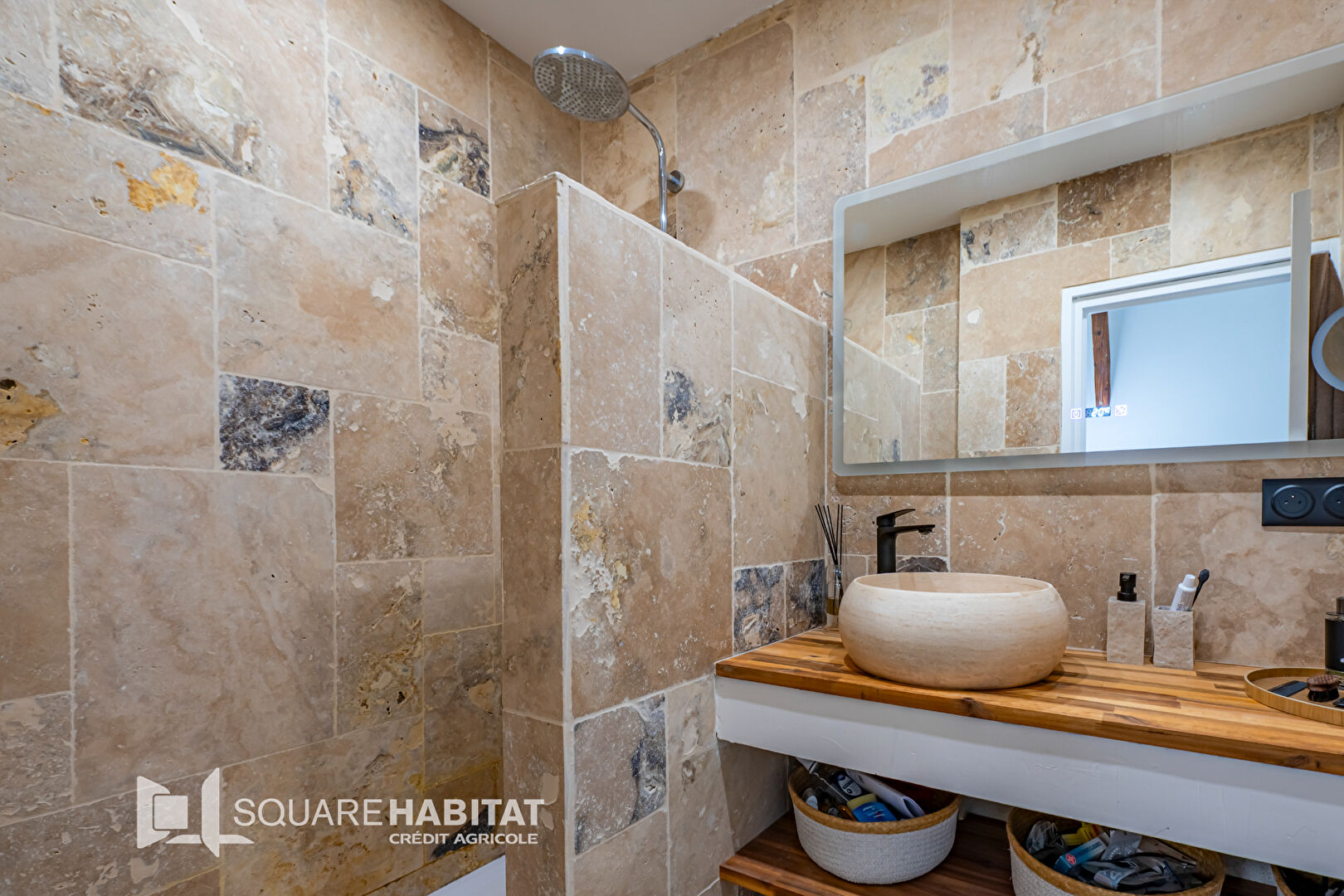 A l'étage, deux grandes chambres mansardées avec placard, une salle d'eau neuve en travertin, douche à l'italienne.