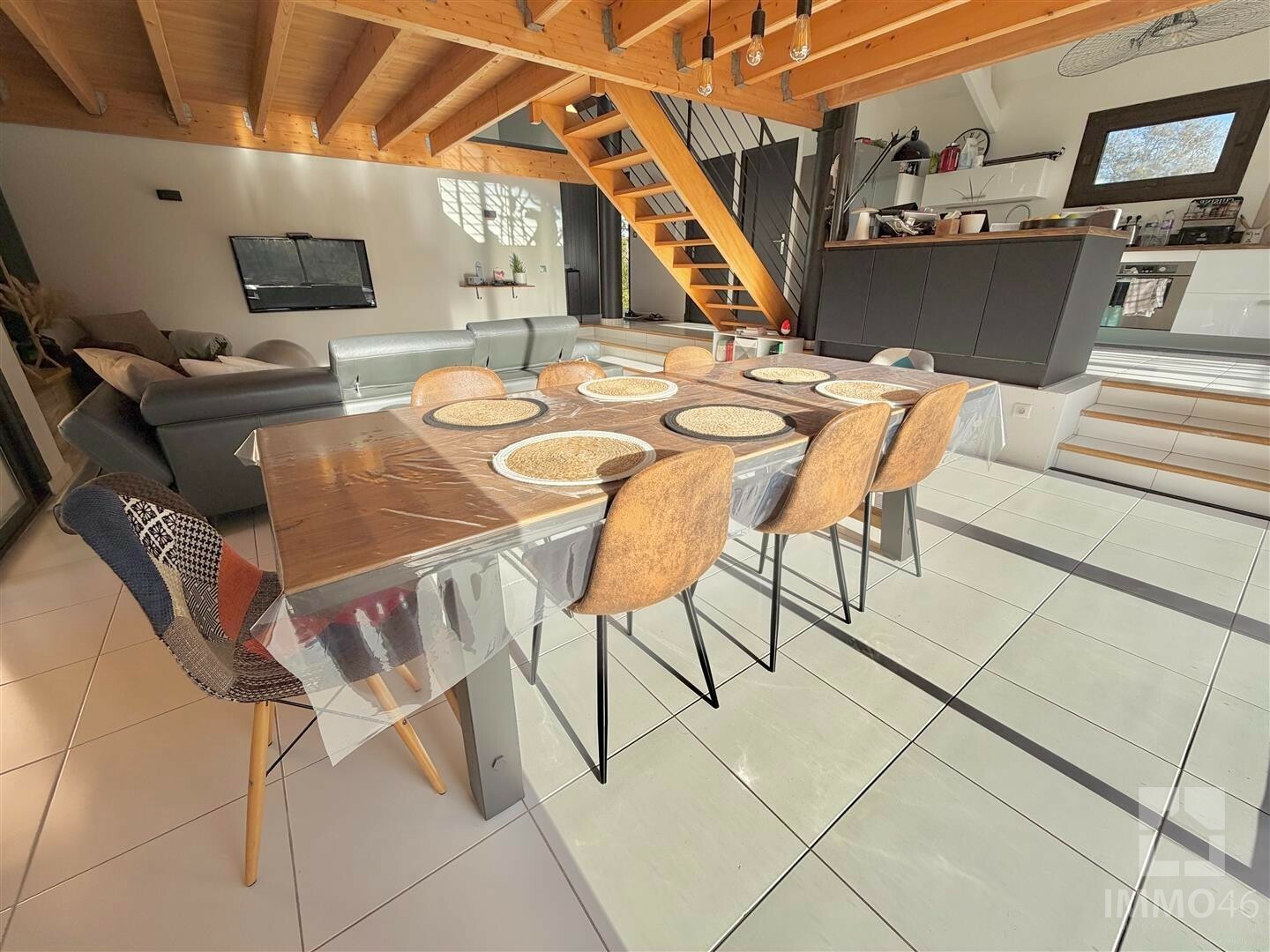 Surplombant la pièce à vivre, une mezzanine de plus de 30m² offre un espace supplémentaire modulable selon vos besoins (bibliothèque, bureau, salle de jeux, espace détente...).