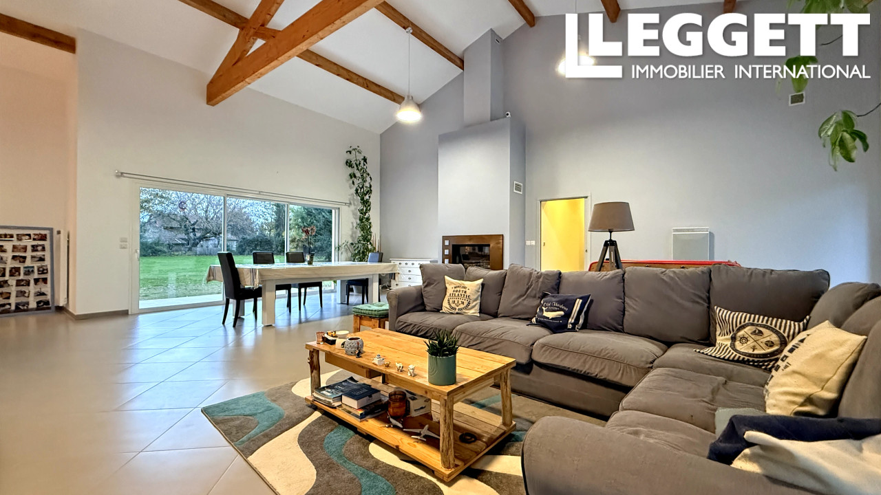 Édifiée sur un terrain de 4000 m² avec vue dégagée sur la campagne, elle offre un vaste espace de vie sous plafond cathédrale avec insert bois, une cuisine équipée, quatre chambres et deux salles d'eau.