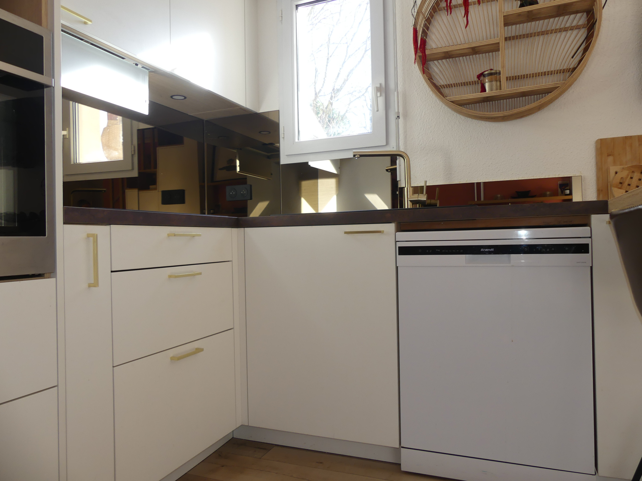 Une cuisine moderne entièrement équipée avec espace repas pour 6 personnes,