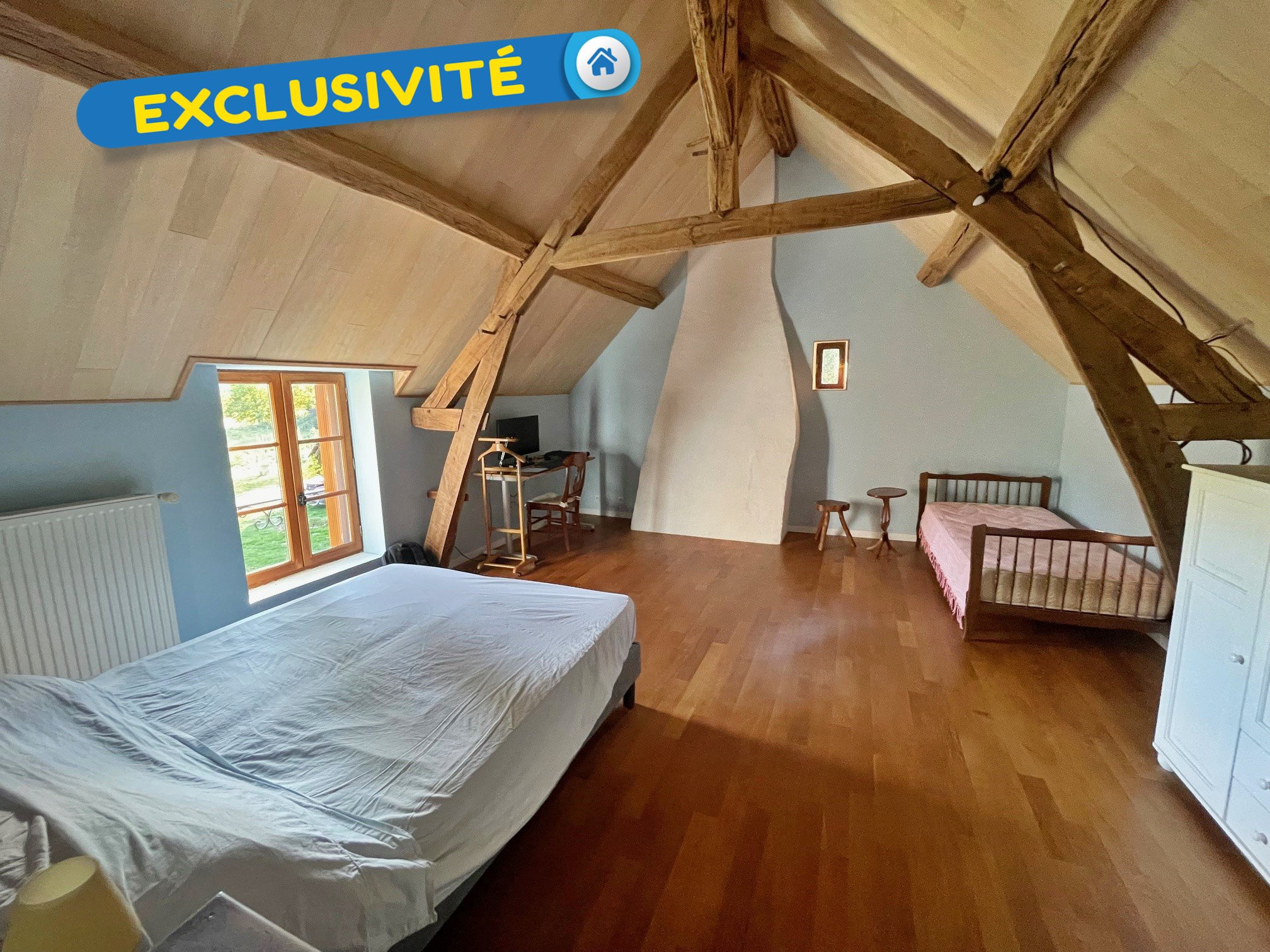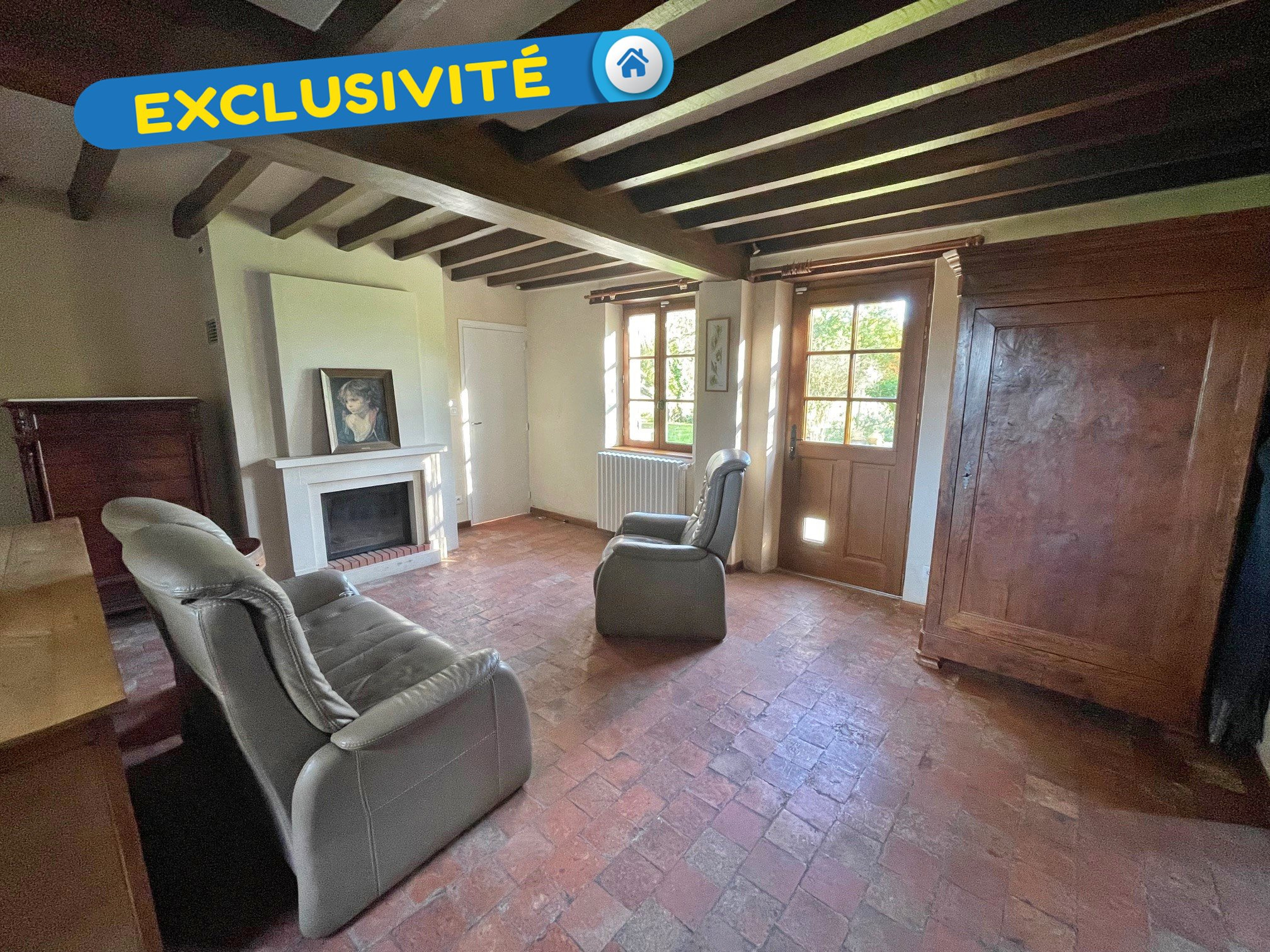 Exclusivité ! Cette charmante ancienne ferme entièrement rénovée séduit par son authenticité et ses beaux volumes. Elle se compose, au rez-de-chaussée, d'une salle à manger chaleureuse équipée d'un poêle à bois, d'un vaste séjour-salon agrémenté d'une cheminée à insert, d'une cuisine aménagée et équipée, ainsi que d'une chambre disposant d'une salle de bains avec baignoire, douche et WC, actuellement utilisée comme vestiaire.