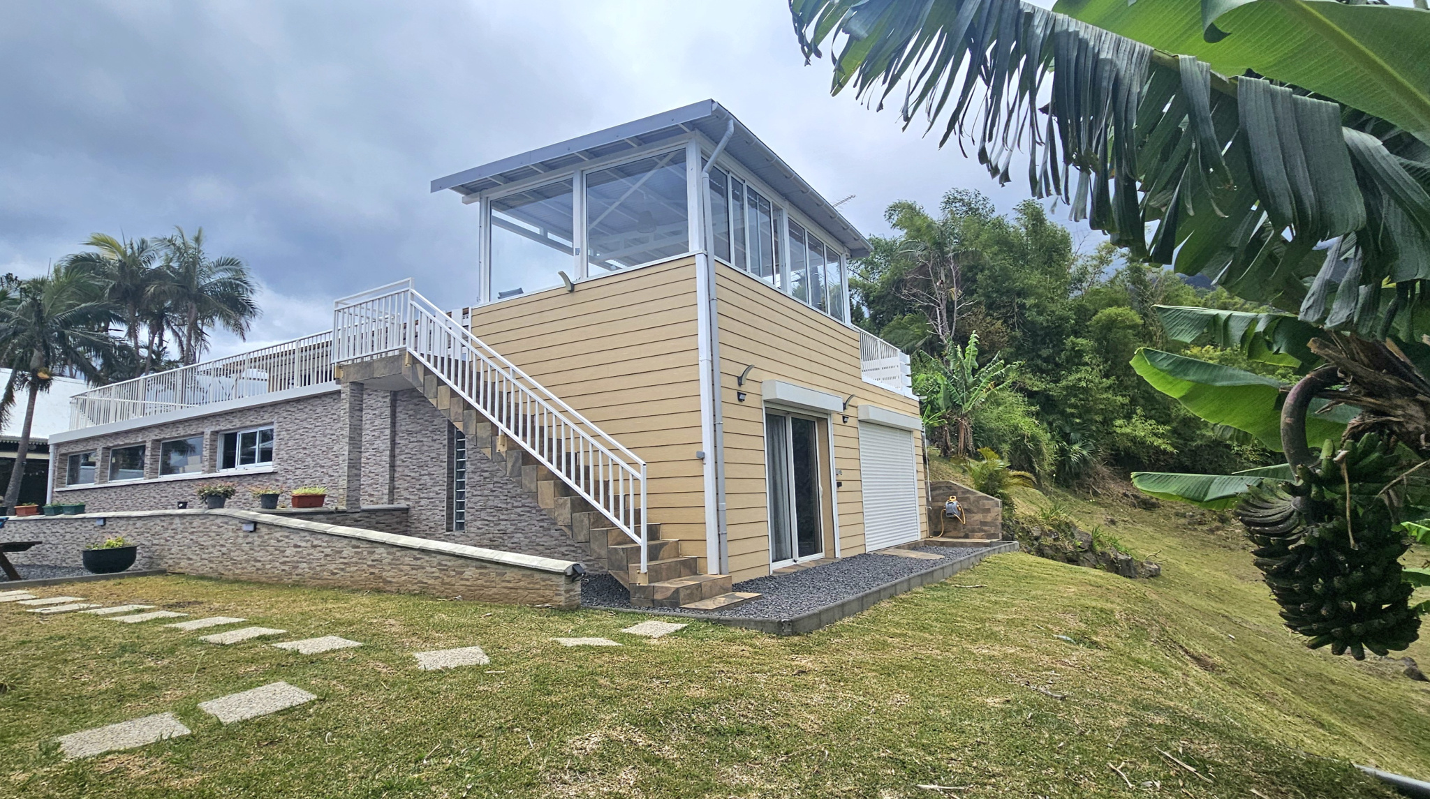 Elle est composée au rez-de-chaussée, de 2 chambres de 11 m2, 1 chambre de 17 m2 environ, un salon, une cuisine 14.5 m2, une grande buanderie et une salle à manger de 22 m2, donnant sur une très grande terrasse/varangue de 110 m2 avec une vue plongeante sur la piscine, et la mer.