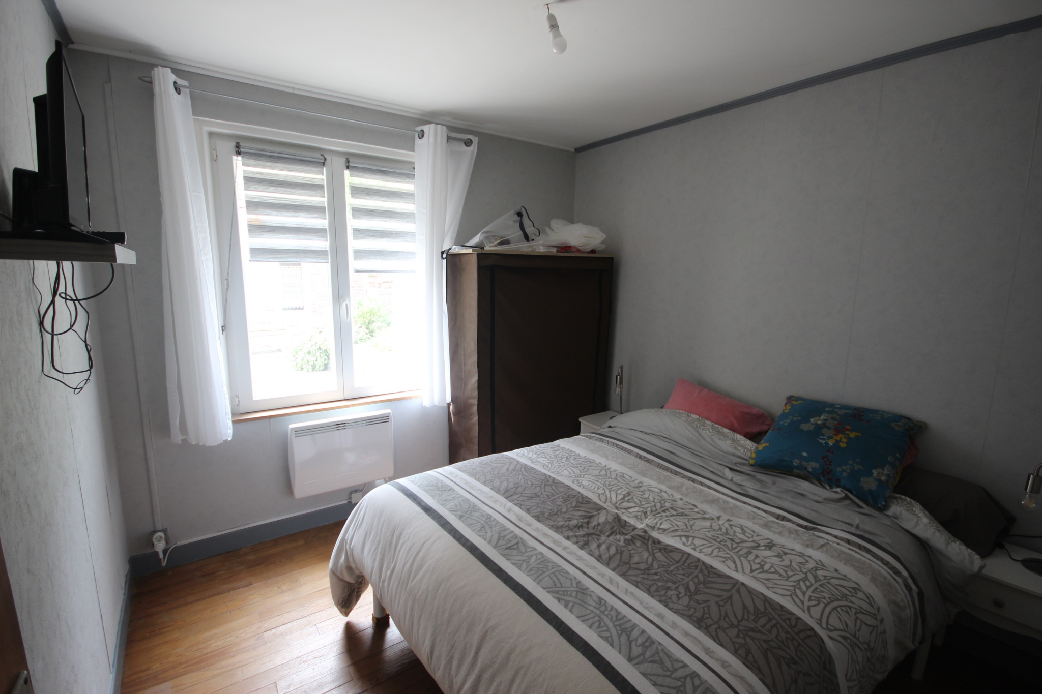 La maison est louée 580EUR mensuels. Elle est habitable de plain pied, et comprend: hall d'entrée, cuisine, salon, chambre, salle de douche avec wc au rez-de-chaussée (pour un total de 59 m2), et un grenier d'environ 67 m2 à l'étage. Chauffage par poêle à gaz, et convecteur électrique.