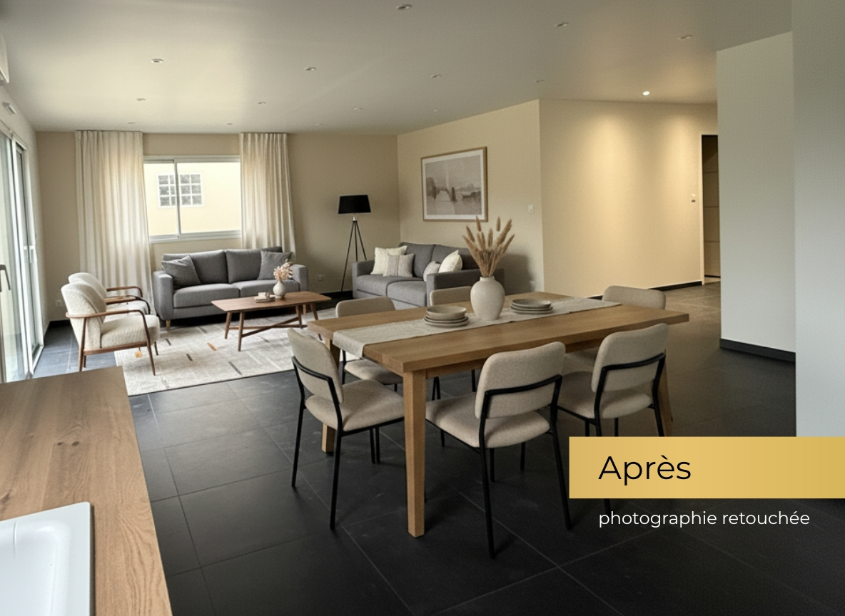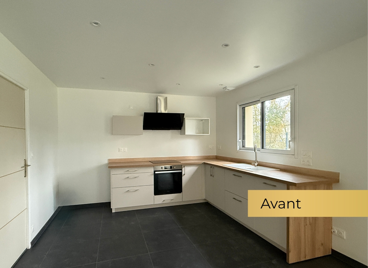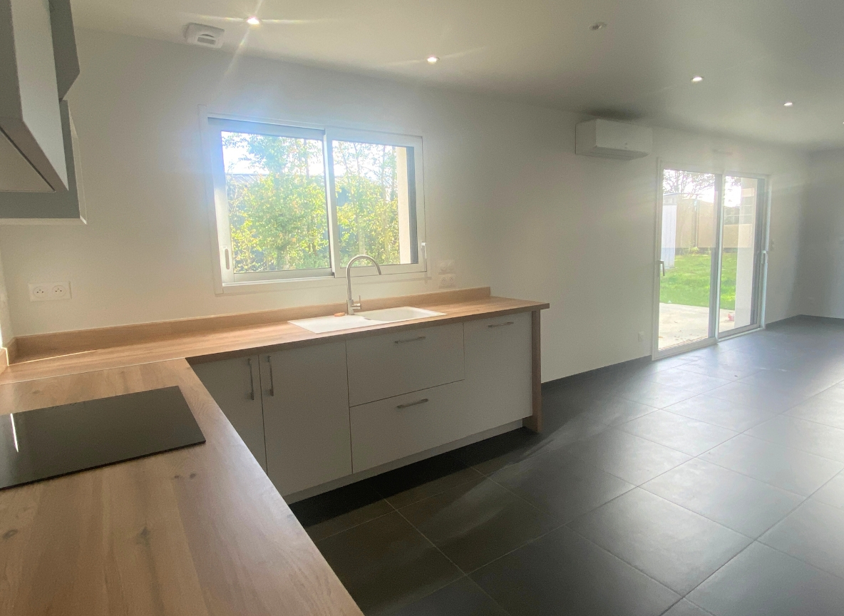 Belle pièce de vie lumineuse avec accès à la terrasse et au jardin, cuisine ouverte aménagée et équipée.