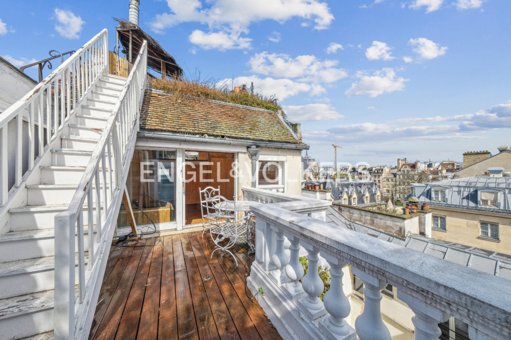 À l'étage supérieur, une suite accessible par un escalier intérieur, une grande salle de bains, une troisième chambre et deux belles terrasses avec vue à 360 degrés sur tout Paris.