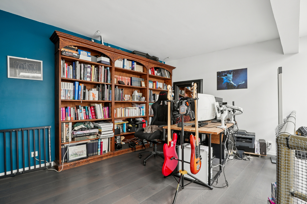 En mezzanine, se trouvent la chambre parentale, une salle de bains, des toilettes et un bureau bibliothèque.