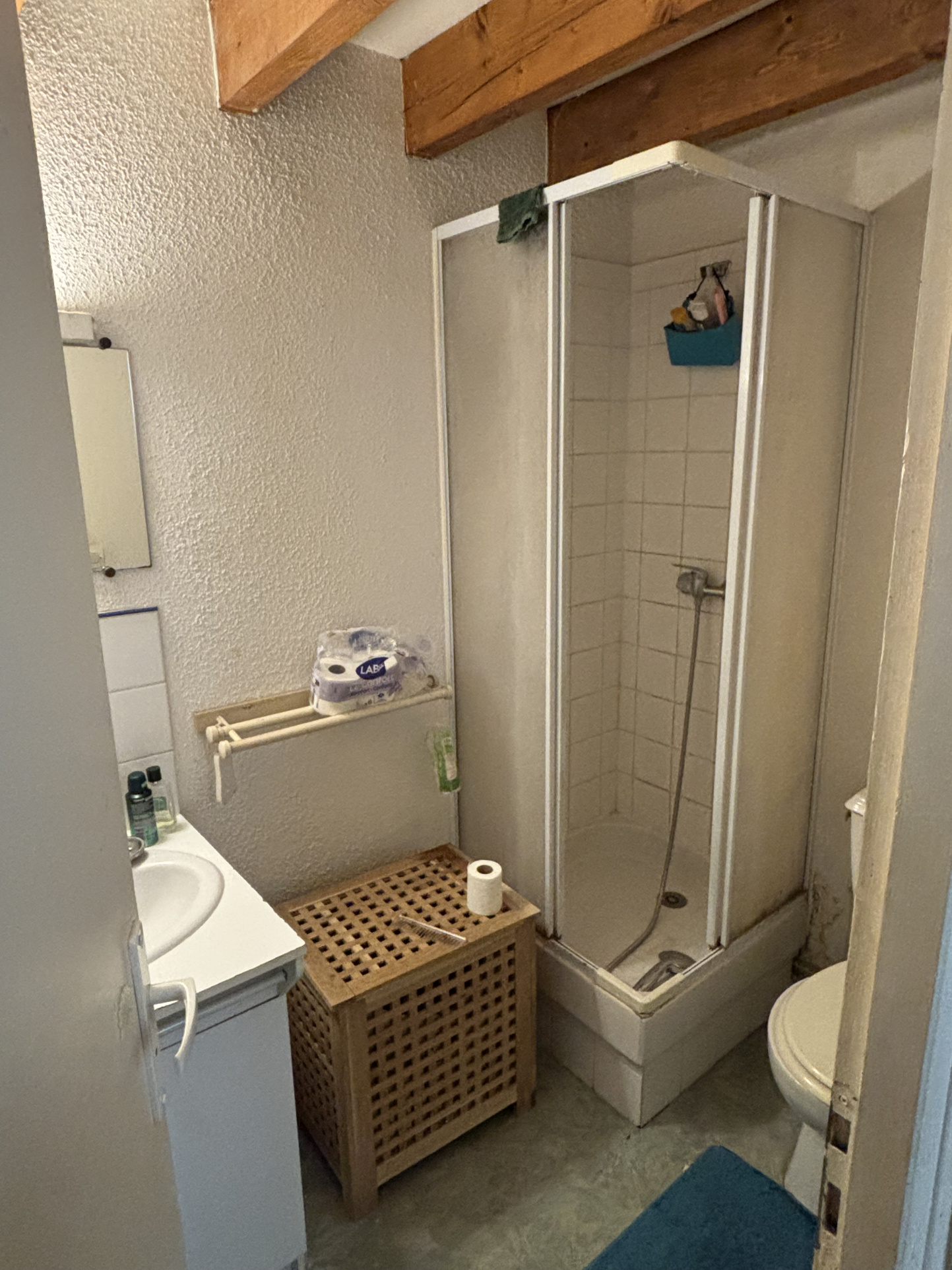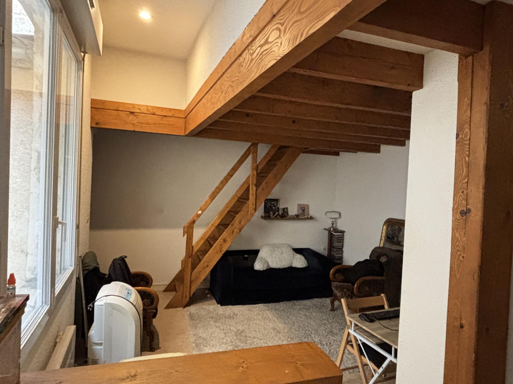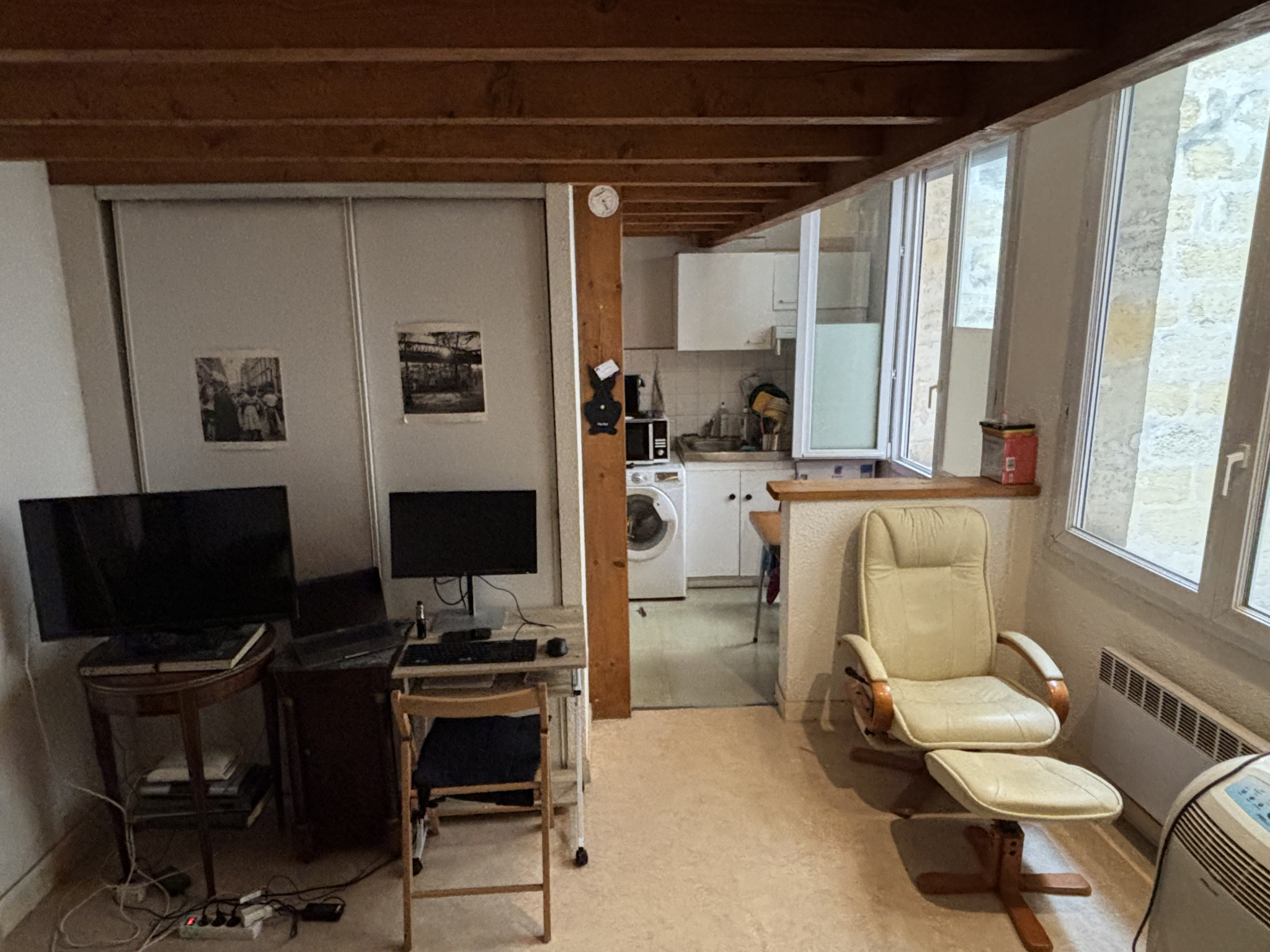Entrée avec placard, pièce de vie avec cuisine/kitchenette, une salle d'eau avec douche et wc. A l'étage, une mezzanine de 12 m2 avec velux (seulement 3 m2 au-dessus de 1.80 m).