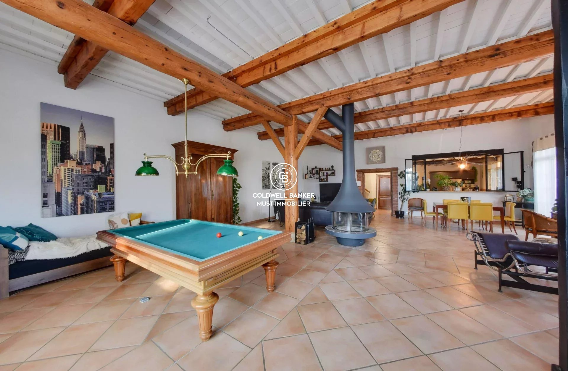 Le séjour majestueux baigné de lumière, révèle de superbes volumes, un poele à bois et des poutres apparentes qui affirment toute l’authenticité du lieu.
