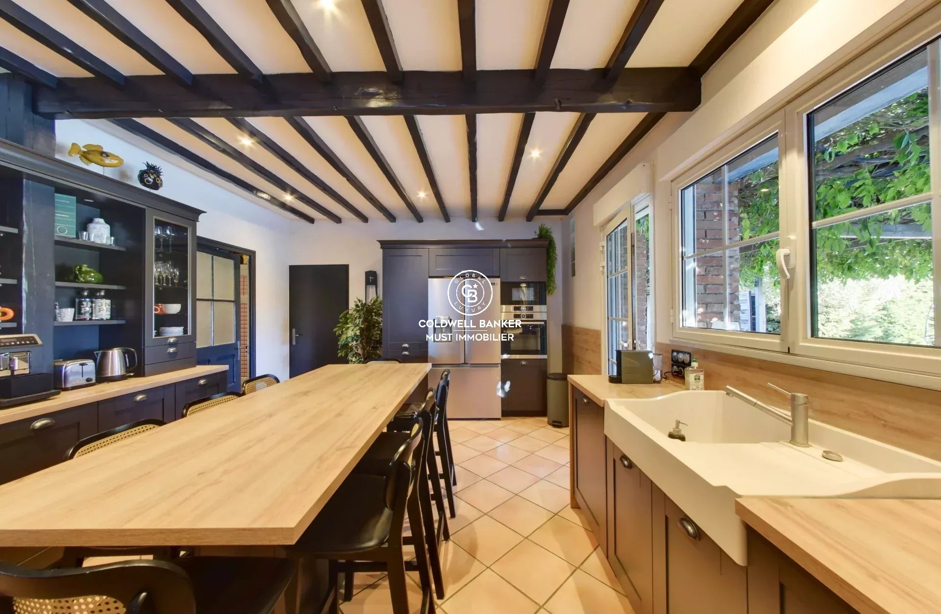 La grande cuisine, élégante et fonctionnelle, s’intègre parfaitement dans cet ensemble raffiné où chaque détail compte.