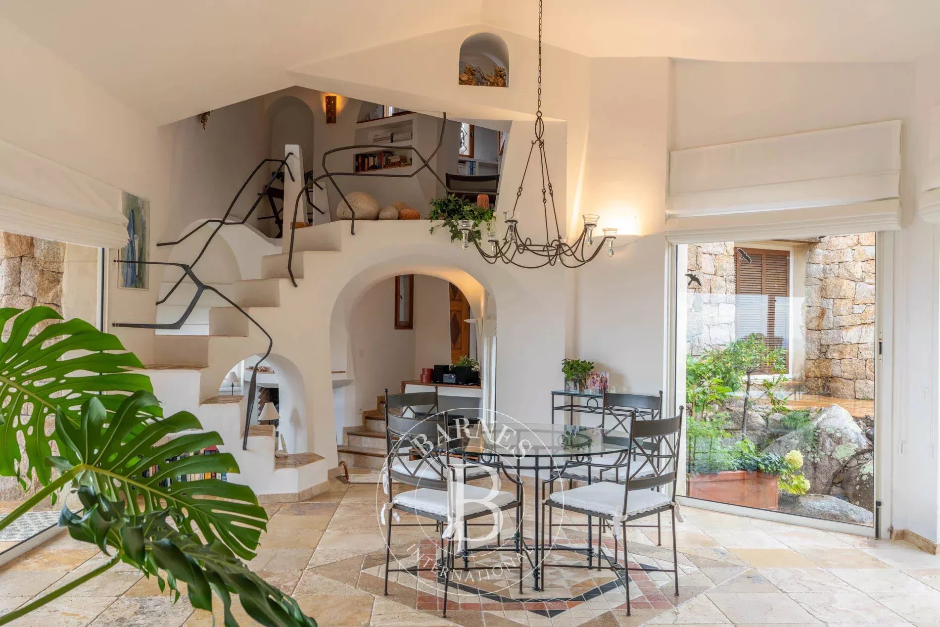 D’environ 354 m², elle s’organise autour d’un patio central baigné de lumière. Les espaces de vie accueillent un salon avec cheminée, une salle à manger en demi-niveau et une cuisine équipée. Buanderie et cave à vin complètent l’ensemble.