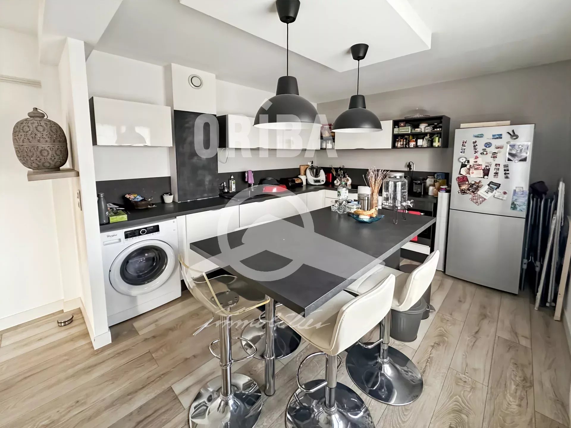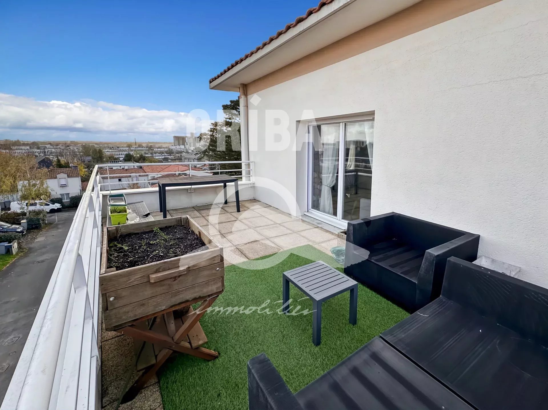 L’appartement, en excellent état général, se compose au premier niveau d’une entrée, d’un WC séparé et d’une belle pièce de vie lumineuse avec cuisine aménagée et équipée ouverte, donnant sur une grande terrasse triplement exposée, idéale pour vos moments de détente en extérieur.
