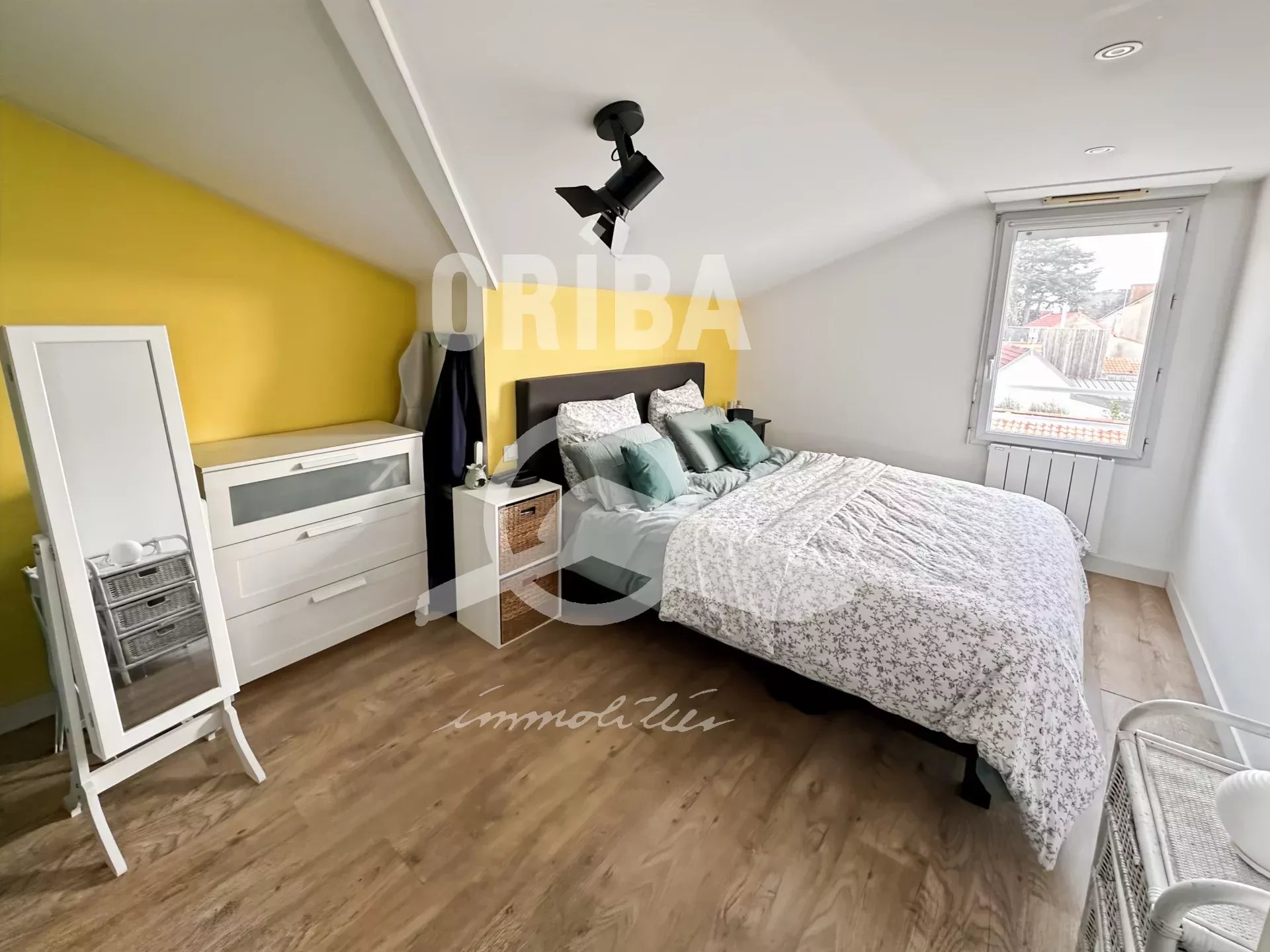 À l’étage, un palier distribue deux chambres confortables ainsi qu’une salle d’eau avec WC.