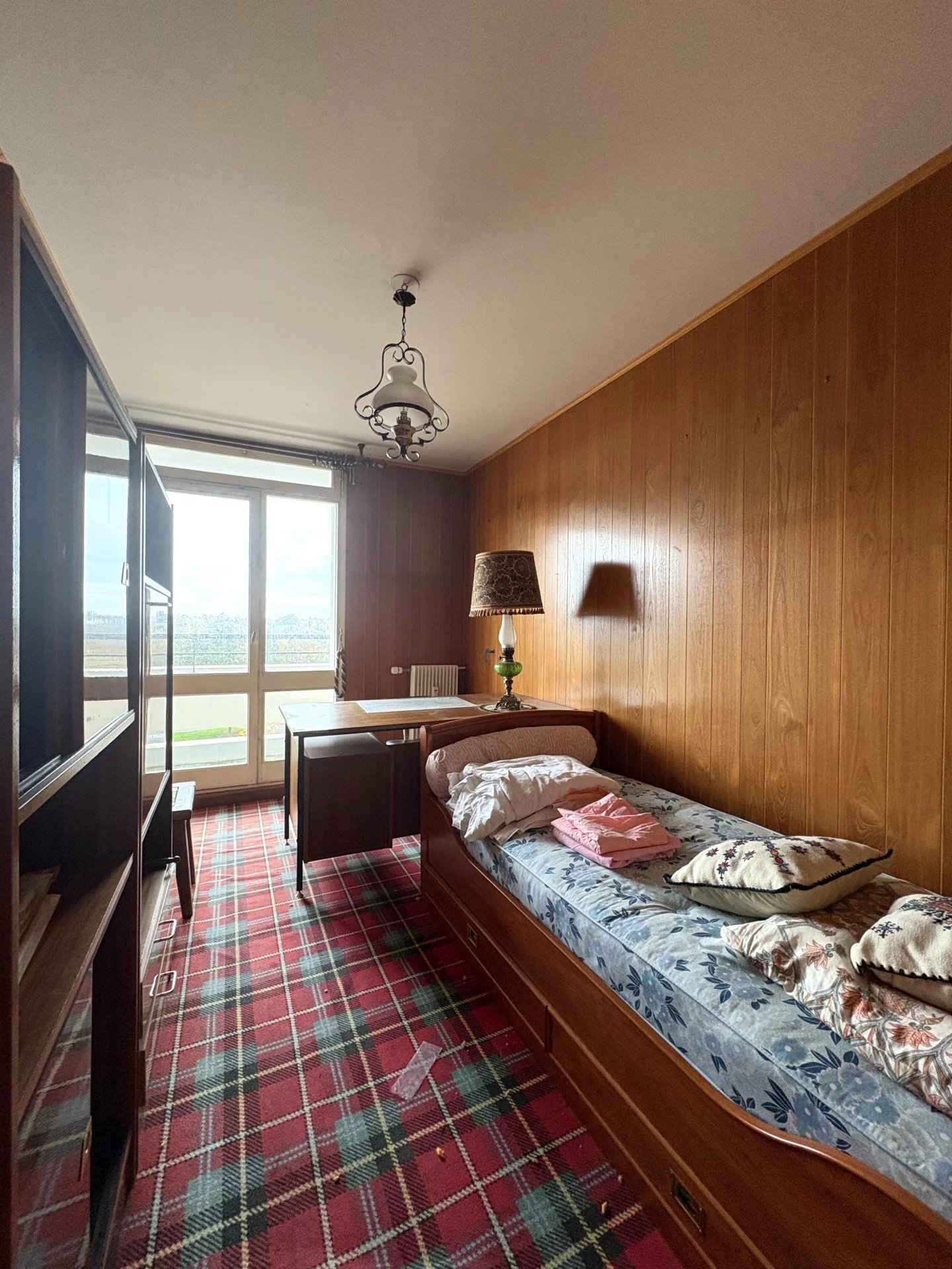 ST BRIEUC, proche facultés et vallée, dans résidence avec ascenseur, appartement 5 P. à rénover : entrée avec placard, séjour salon avec balcon et vue dégagée, cuisine aménagée, buanderie, dégagement avec placard, 3 chambres, cabinet de toilette, salle de bains, W.C. - parking couvert
