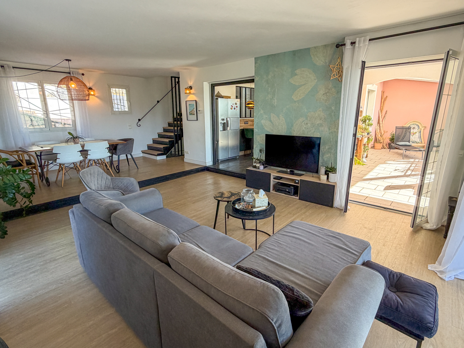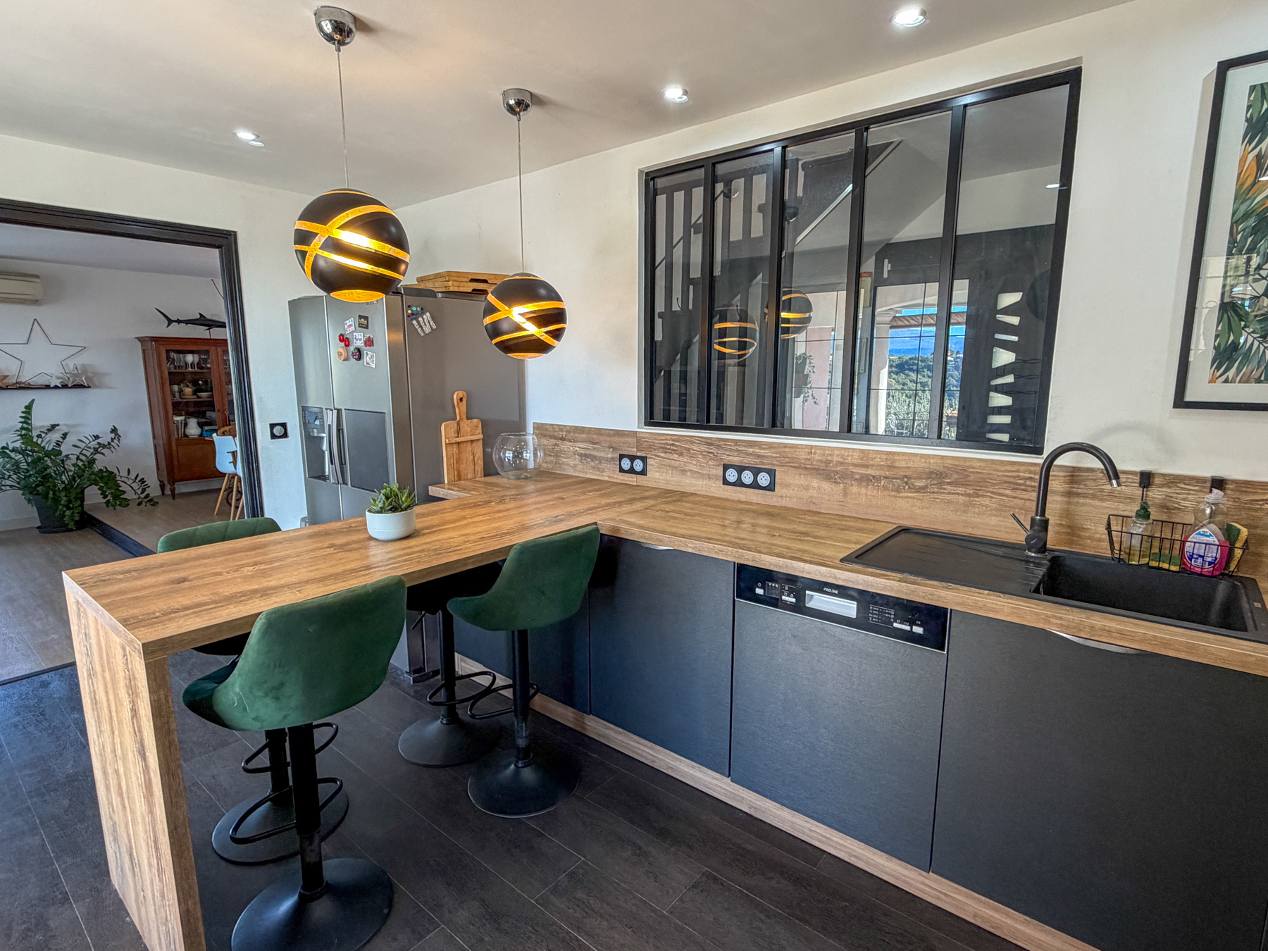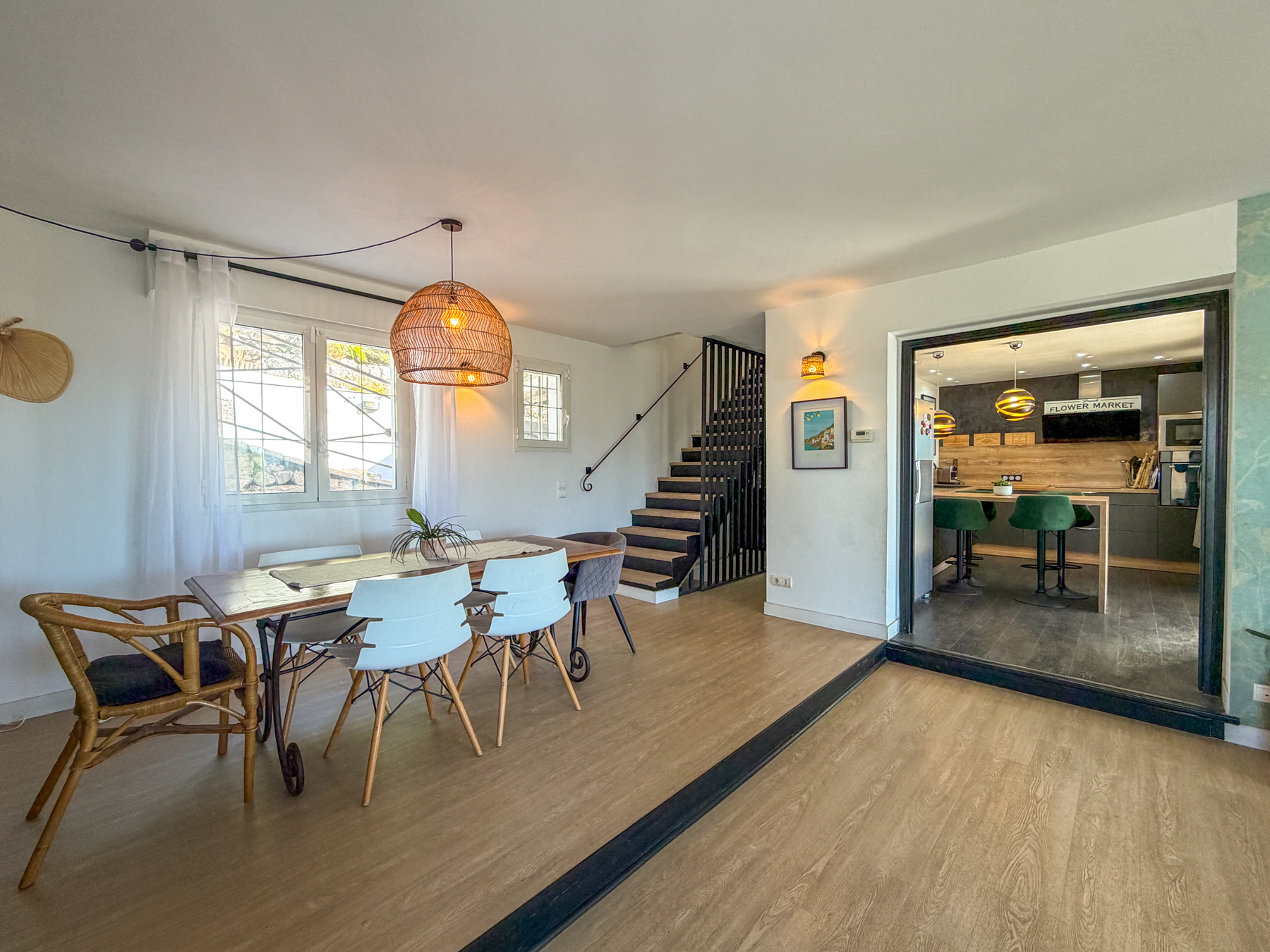 Au niveau principal, profitez d'un vaste séjour baigné de lumière, d'une grande cuisine moderne équipée, et d'une chambre de plain-pied, le tout ouvrant sur une terrasse avec vue panoramique sur les collines et la mer.