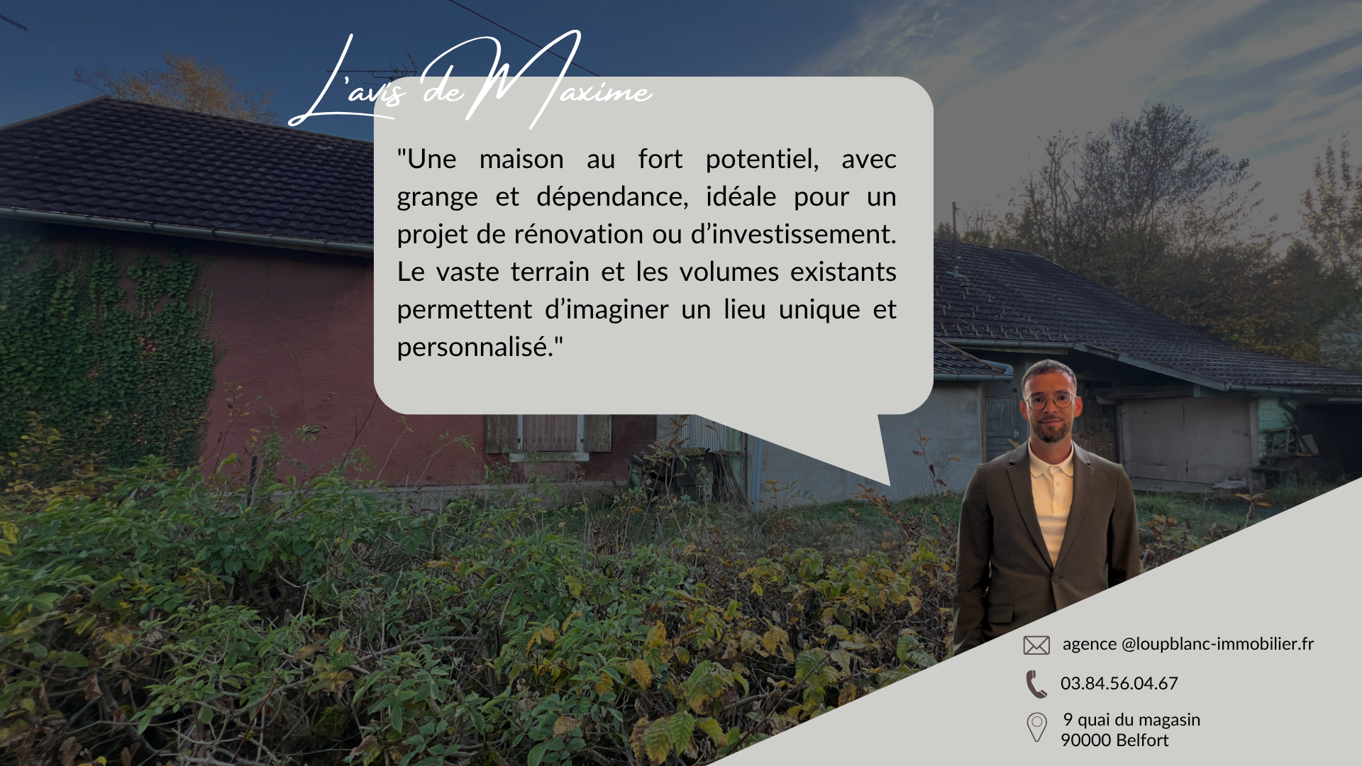 L'avis de Maxime : 'Une maison au fort potentiel, avec grange et dépendance, idéale pour un projet de rénovation ou d'investissement. Le vaste terrain et les volumes existants permettent d'imaginer un lieu unique et personnalisé.'