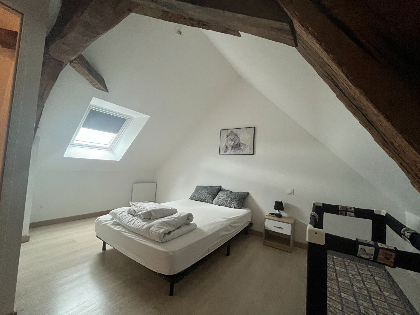 À l'étage, l'espace nuit est composé de deux chambres cosy qui révèlent de magnifiques poutres apparentes.